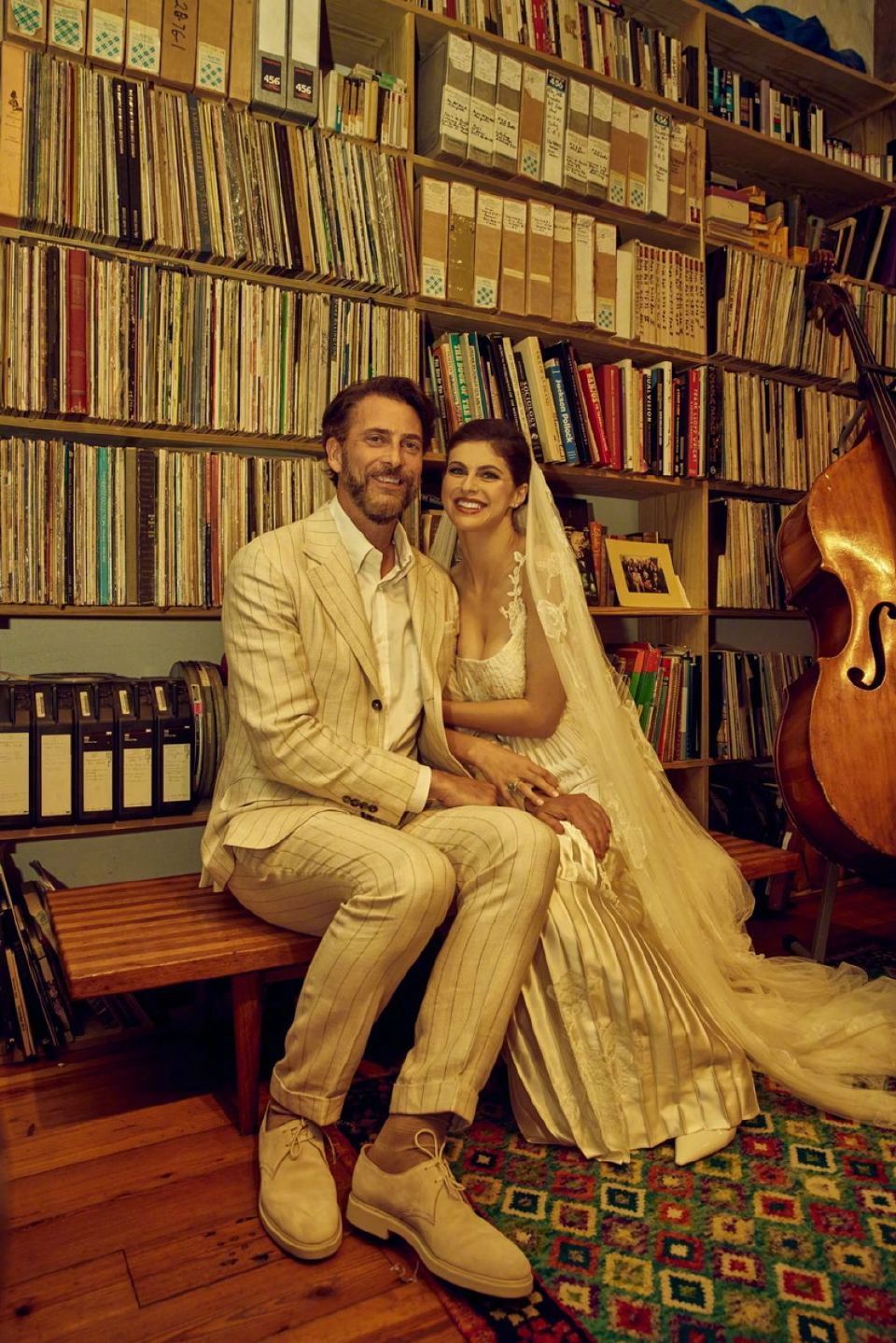 当年结婚,新娘Alexandra 身穿的 Danielle Frankel 为其设计定制的中古风婚纱是真好看。新郎Andrew 身穿的是 Brunello Cucinelli 条纹套装。
