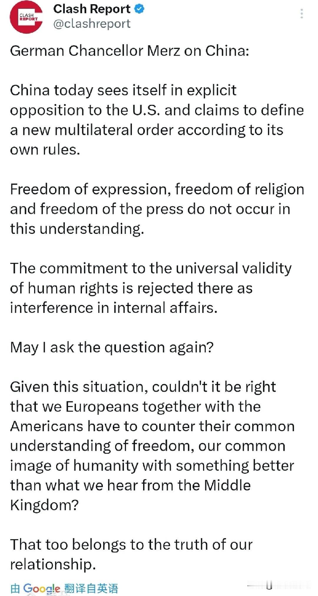 默茨访华前放对华偏激言论 引争议 默茨对华言论捅大娄子。 北京时间2月20日晚,德国总理默茨公开发表讲话,将中国定位为与美国公开对立的一方,声称中方试图以自身规则重塑多边秩序,无端抹黑中国不存在言论、宗教、新闻自由,把中方维护内政的做法歪曲为拒斥人权普遍有效性,喊话欧洲与美国联手,用欧美认定的自由理念与人性认知对抗中国。 这番话满是意识形态偏见,像戴着有色滤镜乱评判他人,尽显西方中心主义的双标做派,无视中国发展成就与民众自主选择,硬把中欧经贸人文交流往对抗的路上带偏。 其言论脱离中德务实合作主流,违背国际关系基本准则,格局狭隘眼光短浅,只会坑德国自身利益,冲击中德及中欧关系的正常发展节奏。 来聊聊你的看法。
