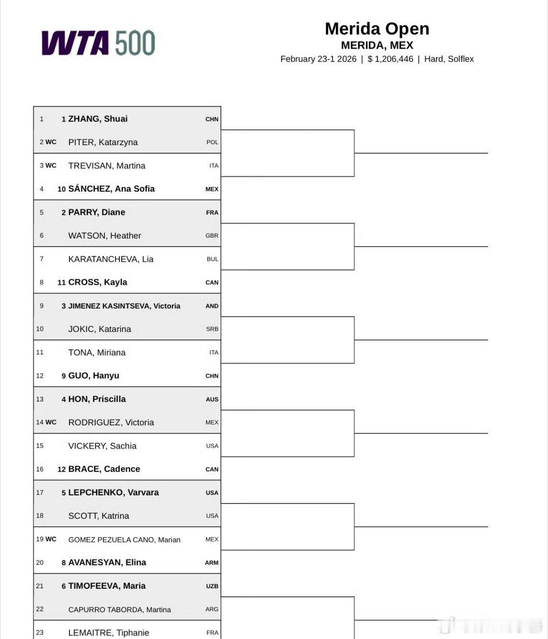 梅里达WTA500资格赛签表张帅🇨🇳 vs 皮特🇵🇱郭涵煜🇨🇳 vs 托纳🇮🇹(已经打进米德兰四强)来不及了张帅本站赛事提前退掉正赛替补(可以排进正赛),出战资格赛,赢一轮13分,突围25分!所以为了保住2🈷️的20分吗,双打搭档谁中国网球 网球talking大会澳网2026