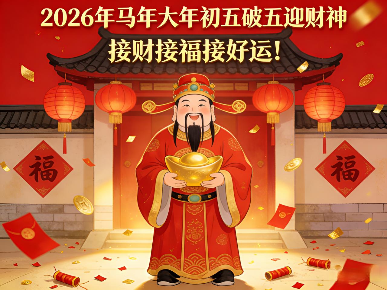 大年初五破五迎财神,马年接财接福接好运! 老传统是吃饺子捏小人嘴,扫穷气送晦气。新潮流是年轻人赛博迎财神,工位求财、理财定投、知识变现。 财神爷最喜欢这三种人:勤快、心善、肯实干。 愿大家2026年正财稳,偏财旺,生意兴隆,日进斗金,全家平安富贵! 初五迎财神开门 初五财神 初五过年习俗 初五迎福纳祥 马年迎财神
