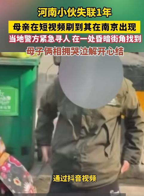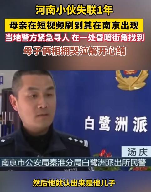 破防!刷视频刷到失联儿子,南京街角一跪看哭全网 科技牵线,母爱破防,一场跨越千里的重逢,暖了整个寒冬。 2026年2月20日消息,河南一名小伙因琐事与家人产生矛盾,负气离家后整整失联1年,家人日夜牵挂、四处寻找却始终杳无音信,漫长的365天里,母亲无时无刻不在担忧儿子的安危与温饱。 命运的转机藏在小小的屏幕里,这位思念成疾的母亲,日常刷短视频时,意外刷到一条南京街头的视频,画面中的身影让她瞬间泪目——那正是自己找寻了一年的儿子!确认身份后,家人心急如焚,立刻联系当地警方寻求帮助。 南京民警接到求助后,第一时间展开紧急寻人,顶着寒风排查街巷、调取监控,最终在一处昏暗的街角,找到了独自漂泊、处境窘迫的小伙。见到日夜思念的母亲那一刻,小伙再也绷不住情绪,当场跪地痛哭,积压一年的愧疚与思念瞬间爆发,母子俩紧紧相拥、泣不成声,所有的矛盾与隔阂,在这一刻烟消云散。 这世上最温暖的路,永远是回家的路;最坚定的牵挂,永远是母亲的守望。短视频本是娱乐消遣,却意外成为团圆的桥梁,让分隔一年的母子得以重逢,这份双向的牵挂,藏着最动人的人间温情。出门在外的游子,无论遇到什么难处,家永远是最坚实的港湾,别让一时的任性,辜负了家人的等待。 看完这场暖心团圆,你有什么感触?快来评论区聊聊,也别忘了点赞+转发,把这份团圆的好运传递下去,愿所有分离都能重逢,所有思念都有回应!