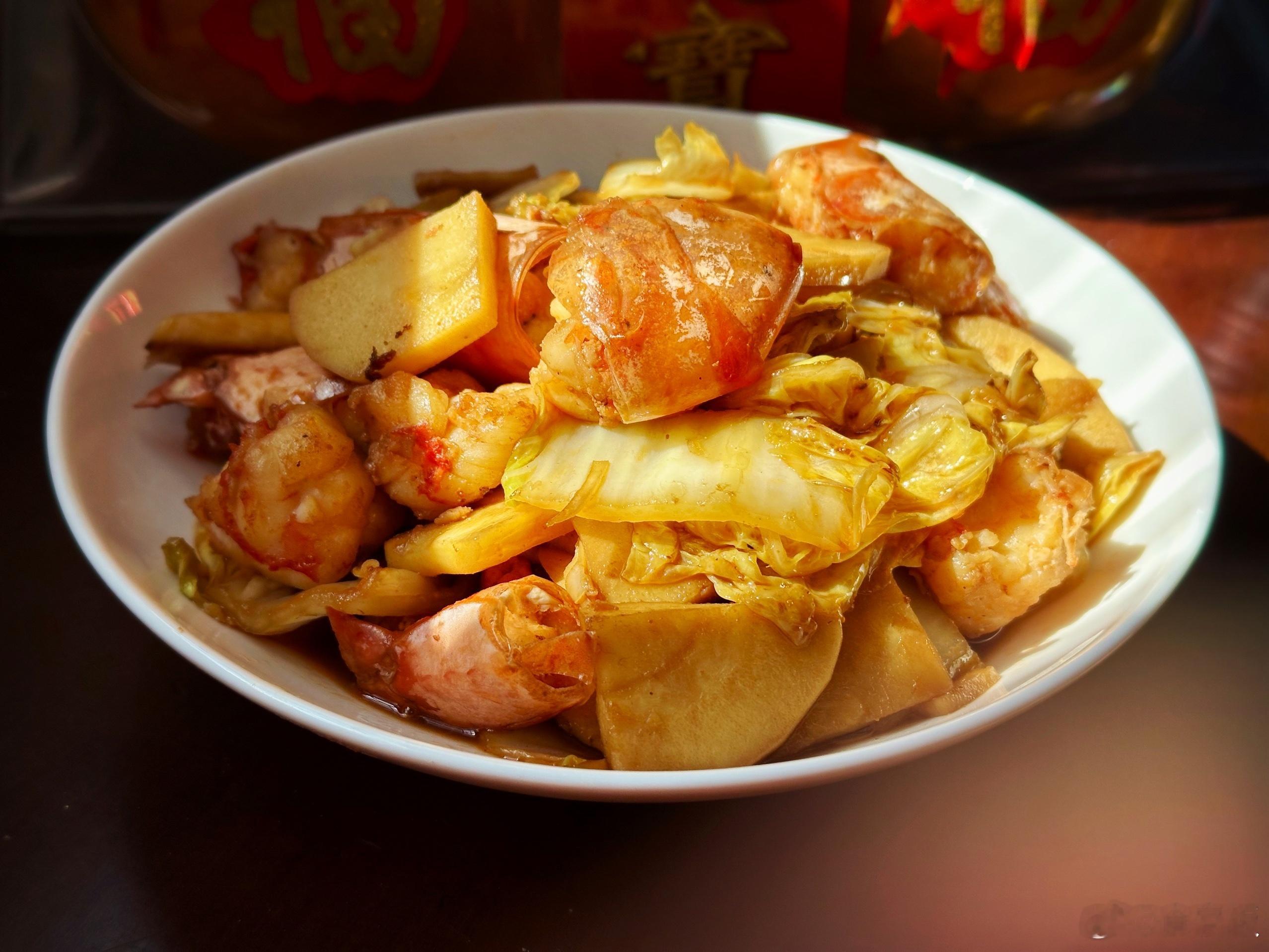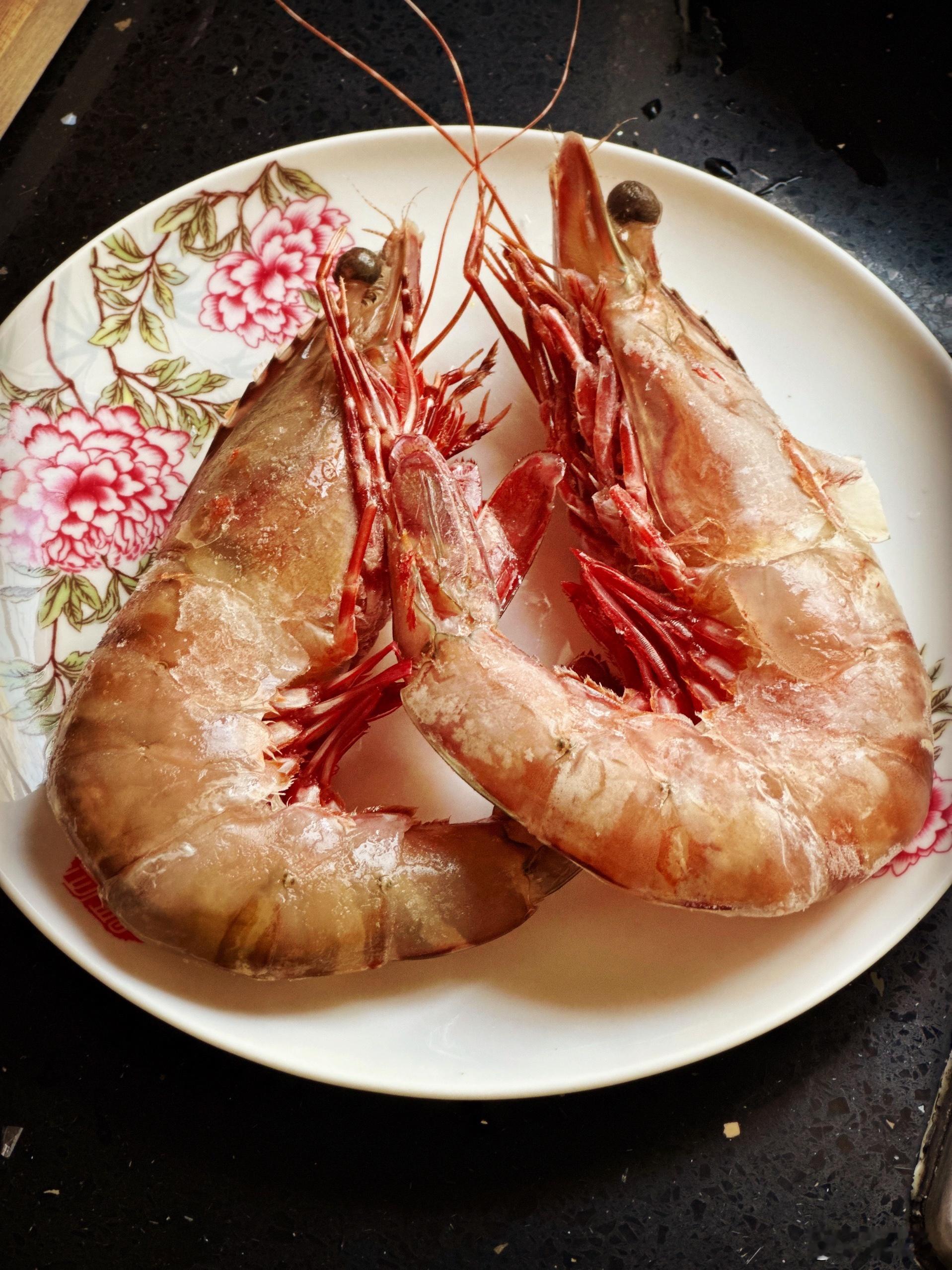 从前,明虾总是这么一对对的卖。像这样巨大的两只,就足够做一碟菜。明虾开背切段,虾背里粗粗一股青蓝色虾黄,嗲得很。虾头煸出红油,虾段煸一煸,冬笋黄芽菜也要事先分别煸过。乃么好回进锅里焖明虾,淡酱油调味,否则就可惜了明虾的亮红色。明虾有特殊香味,这香味跑到冬笋黄芽菜里面,好吃得不得了。香草羊排。红嘴绿鹦哥,用淡淡的日式出汁做一只汤。半间灶披间菜单