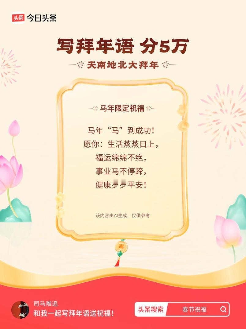 写拜年语送祝福新春拜年送祝福!我的祝福是:“马年“马”到成功!愿你:生活蒸蒸日上,福运绵绵不绝,事业马不停蹄,健康岁岁平安!”!快来一起写祝福吧戳这里,一起领红包>