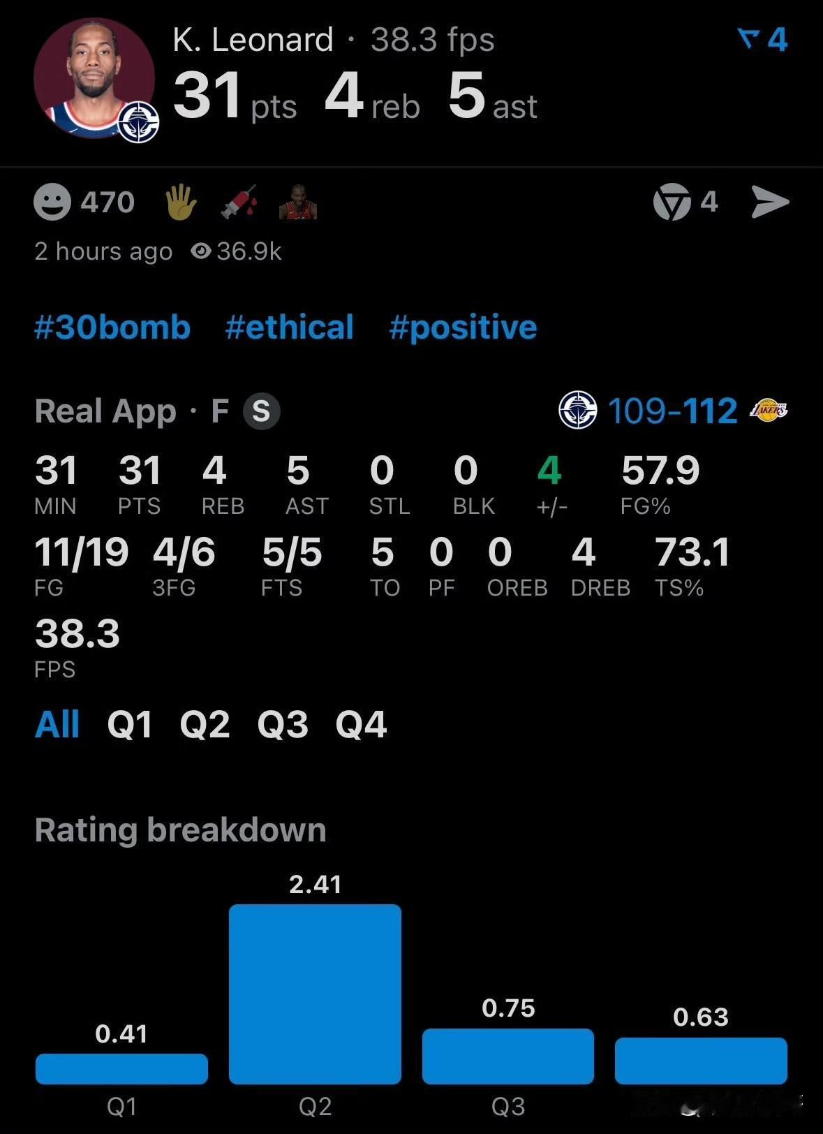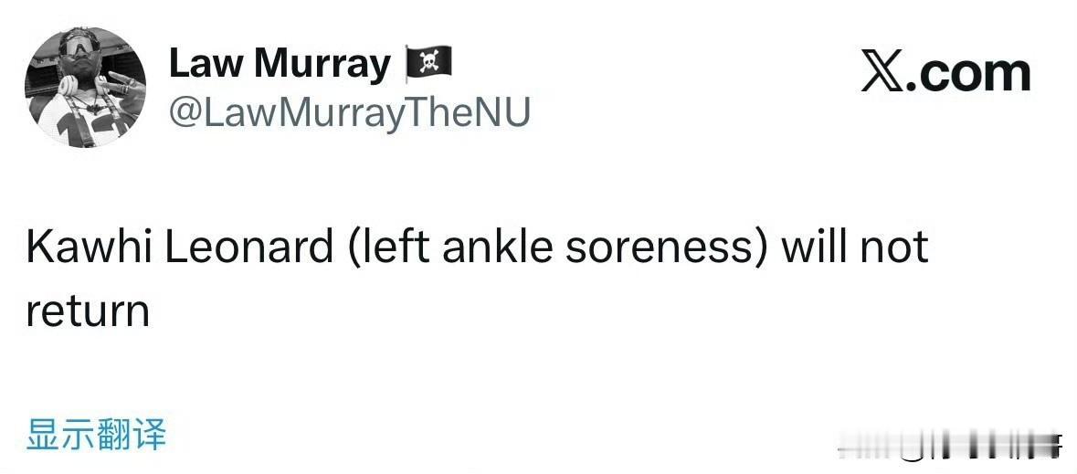 今天的比赛就打到这儿!!!伦纳德左脚踝酸痛退出比赛,不会回归!集卡领红包 根据记者穆雷最新消息透露,快船球星伦纳德在和湖人的比赛中因为左脚踝感到酸痛而退出比赛,本场比赛不会回归了。 目前快船和湖人的比赛马上就要结束了,湖人大概率可以拿下比赛了,而伦纳德本场比赛的数据也定格了,他出战31分钟,得到31分,命中率也是相当不错,就是没能坚持到最后。 如果伦纳德在可能还有希望翻盘,他下场之后快船就只有马瑟林一个进攻点,所以快船本场比赛就要交代了!湖人 快船
