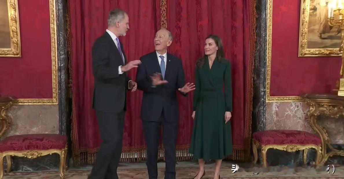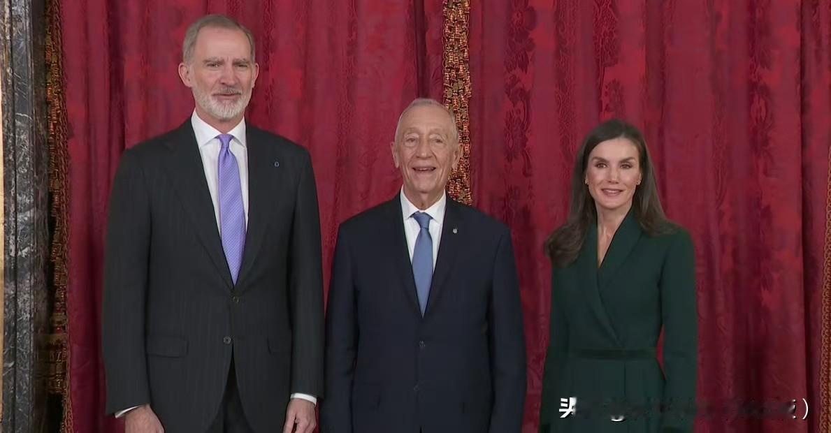 国王夫妇在马德里皇宫接待到访的水果牙大叔,王后的墨绿大衣连衣裙来自王室裁缝。当然