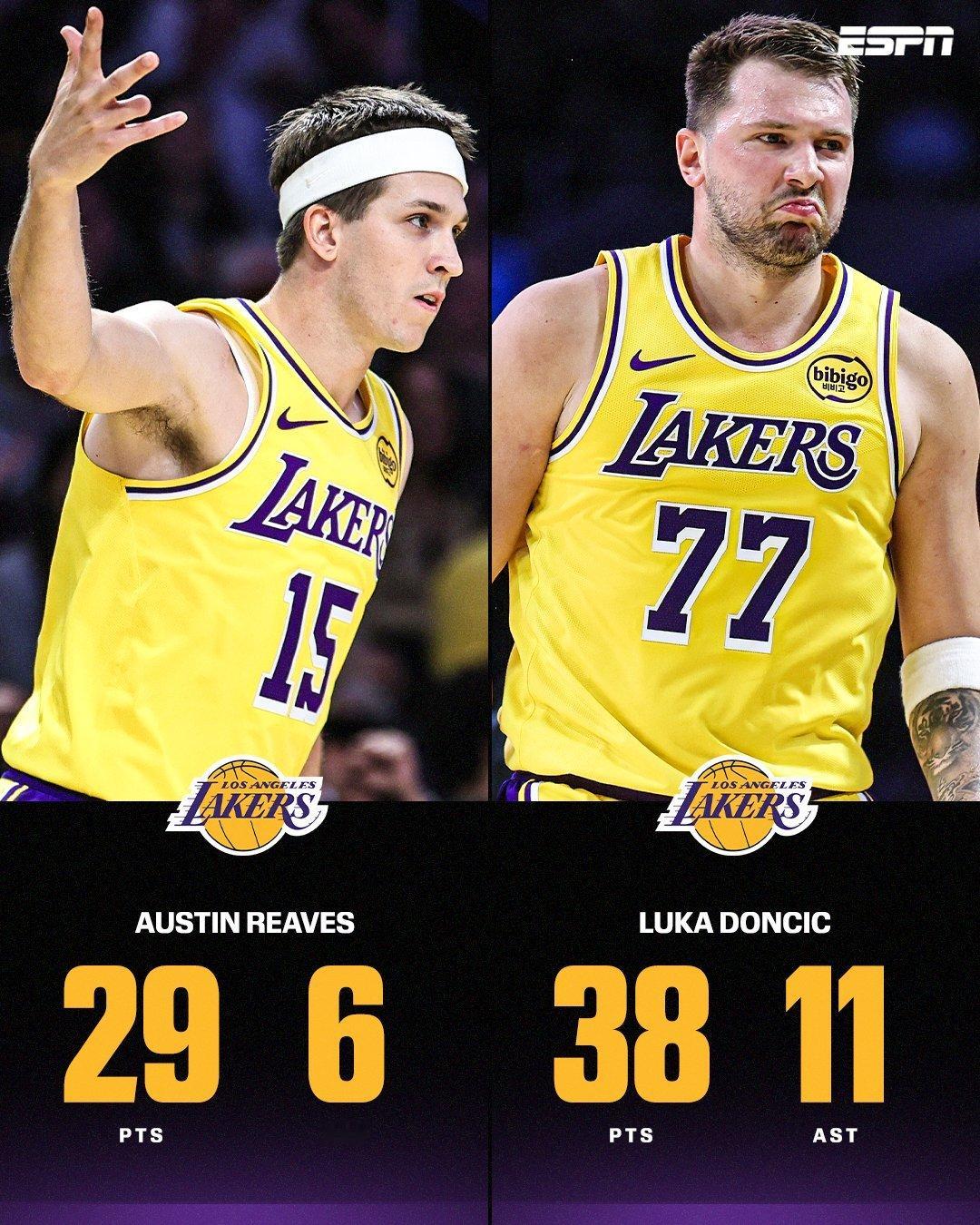 ——东契奇,38分6篮板11助攻——里夫斯,29分6篮板2助攻——詹姆斯,13分3篮板11助攻