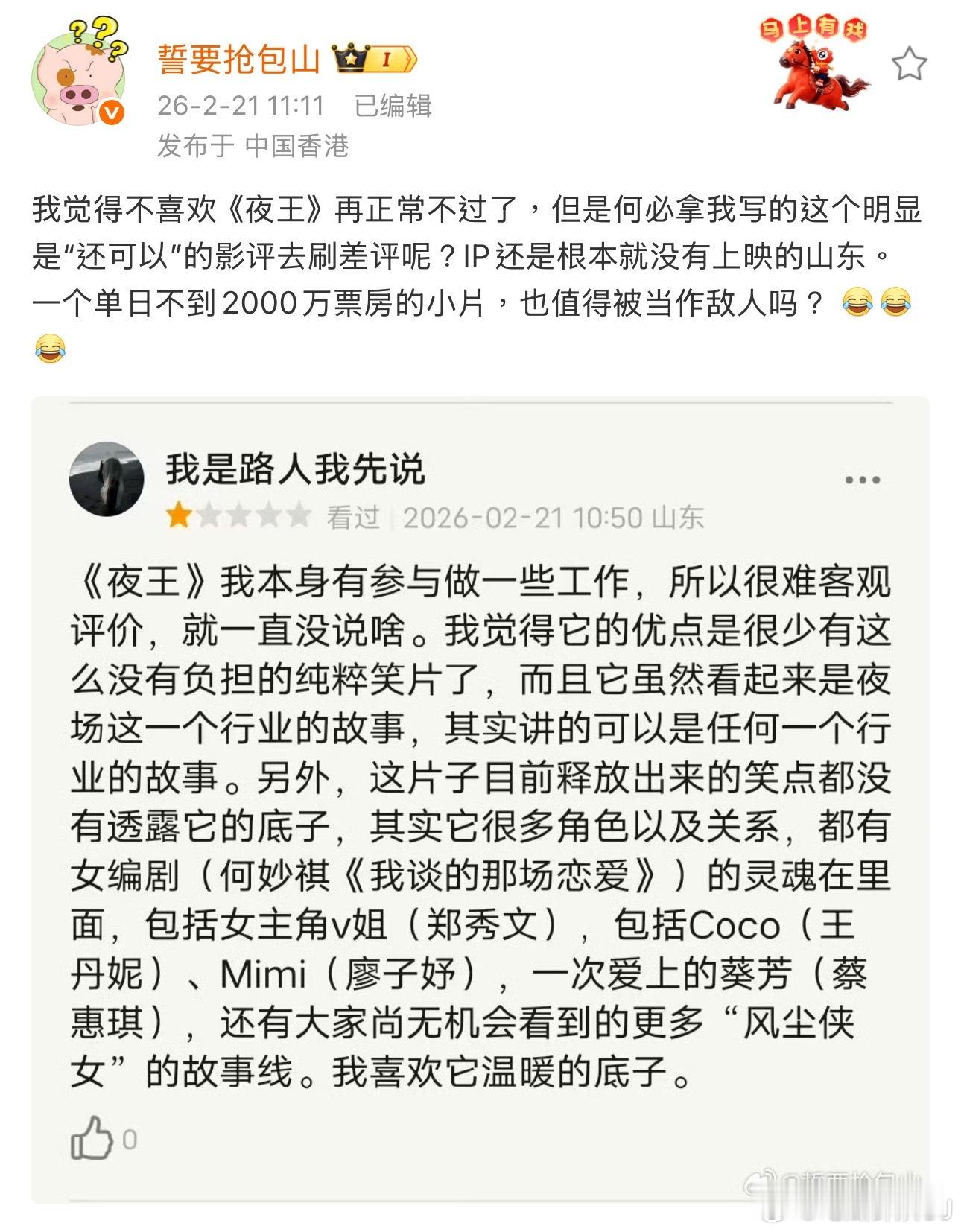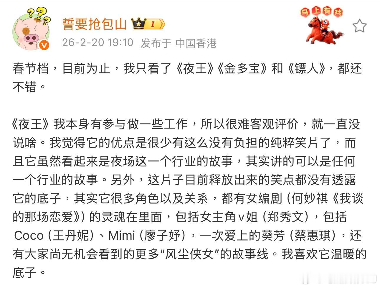因为她这几年就是在香港做影视相关,知道有一部分关注者非常信任她的评价,所以repo尽量克制中立。对比我前一条说得眉飞色舞的输出就能看出,原博几乎是没对自己参与的《夜王》做太多夸赞,只是点出了自己视角里不可被忽视之处。