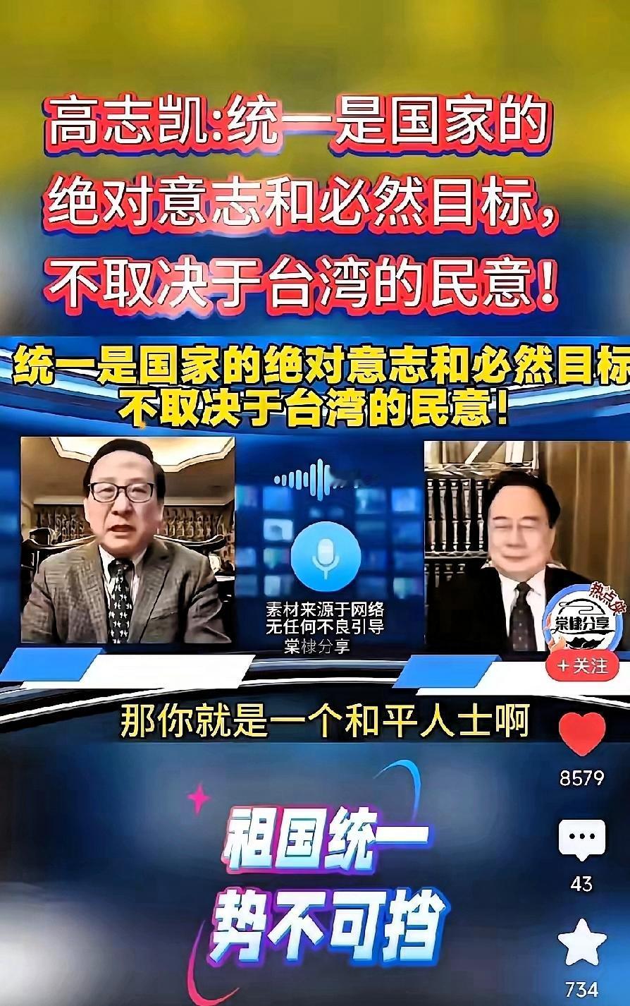 台湾一些政客口口声声说,大陆统一台湾要看台湾民意,要问问2300万台湾人同意不同意?高志凯教授说:荷兰人占领台湾,郑成功收复台湾,康熙帝统一台湾,蒋介石败退台湾,日本割据台湾都没有经过台湾人的同意。 国家统一从来不是地方投票能决定的,这是主权问题,是全体中国人民的意志,更是历史必然。那些拿民意炒作的人,不过是想混淆视听、拖延统一进程。台湾是中国不可分割的一部分,统一没有任何商量余地,更不会被少数人的话术绑架。无论阻力多大、杂音多响,祖国必须统一、也必然统一,这是任何人都阻挡不了的大势。