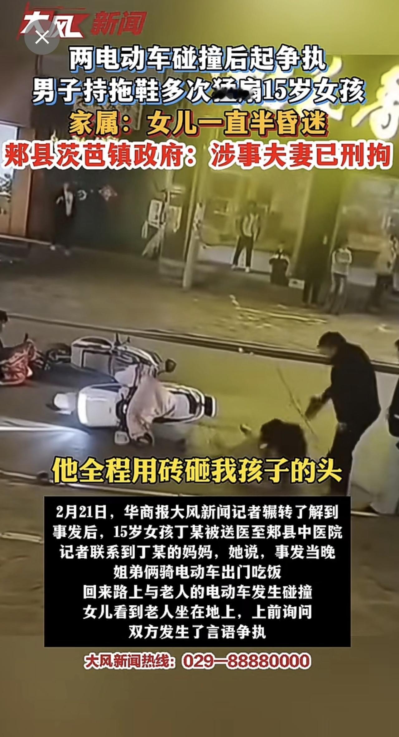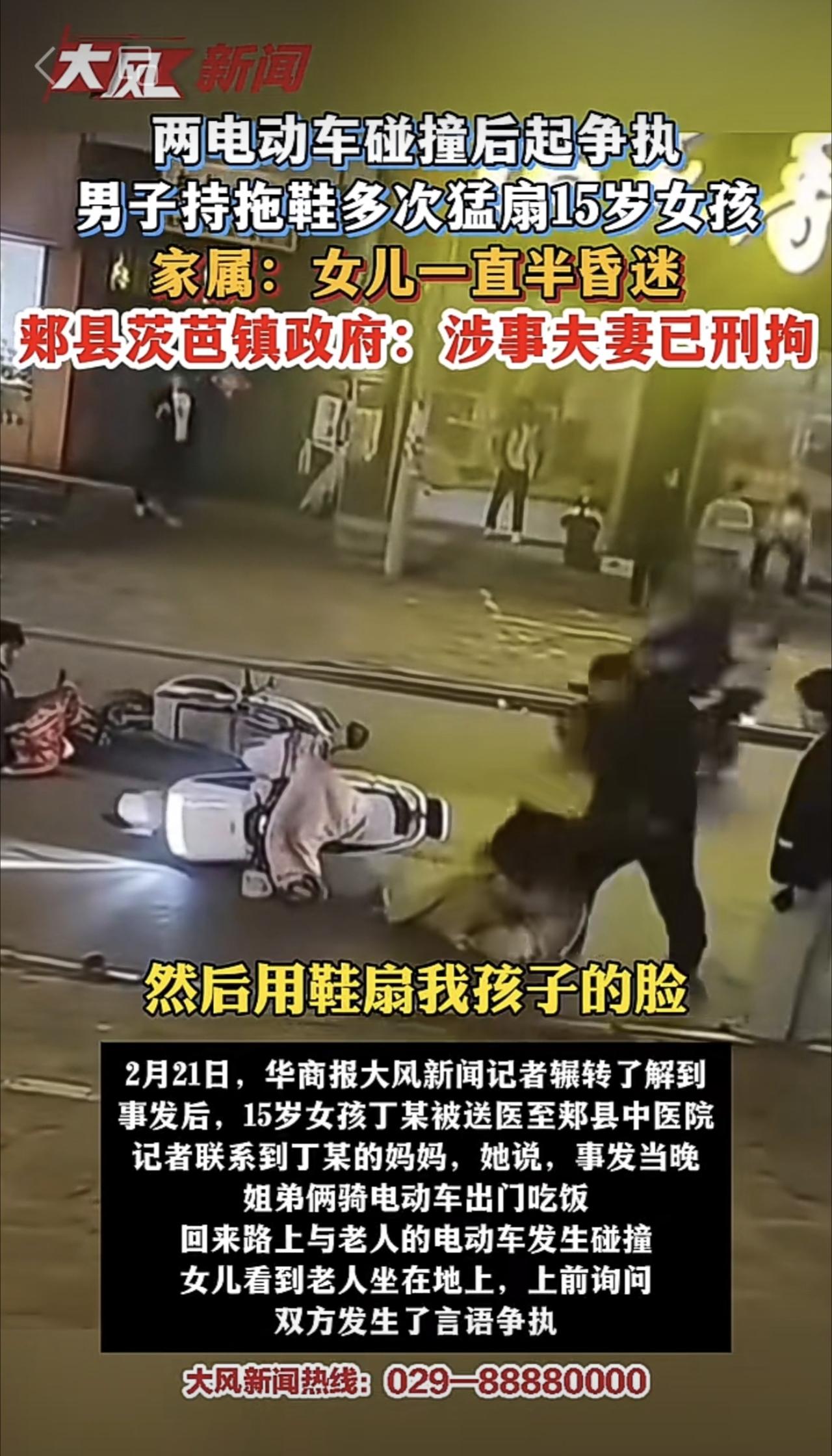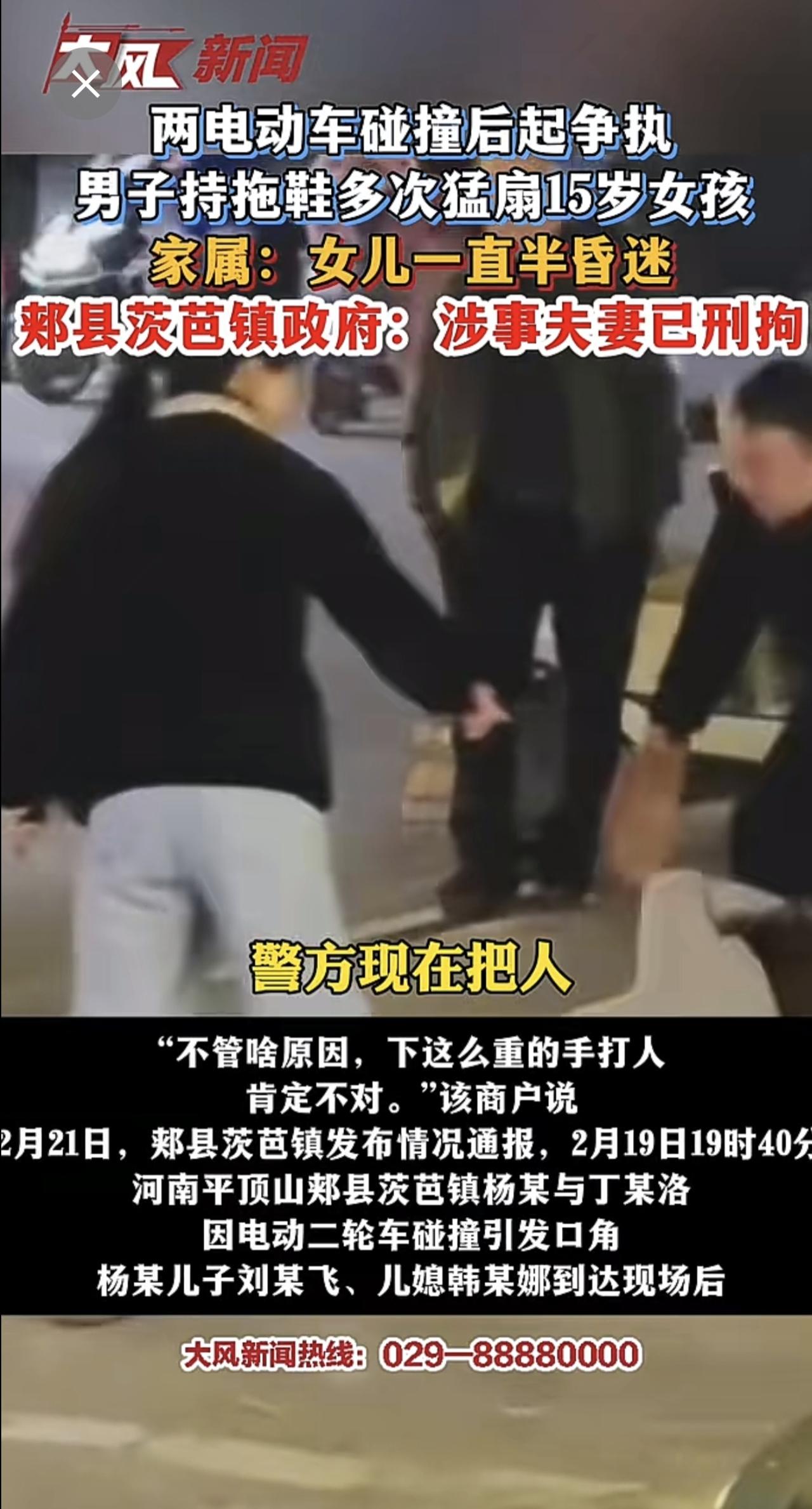 两电动车碰撞后起争执 男子持拖鞋多次猛扇15岁女孩 家属:女儿一直半昏迷 郏县茨芭镇政府:涉事夫妻已刑拘