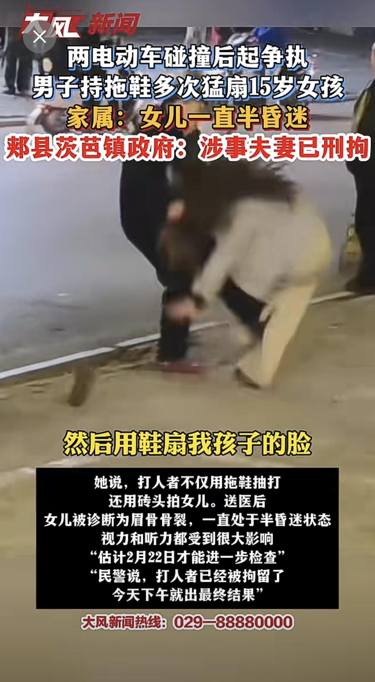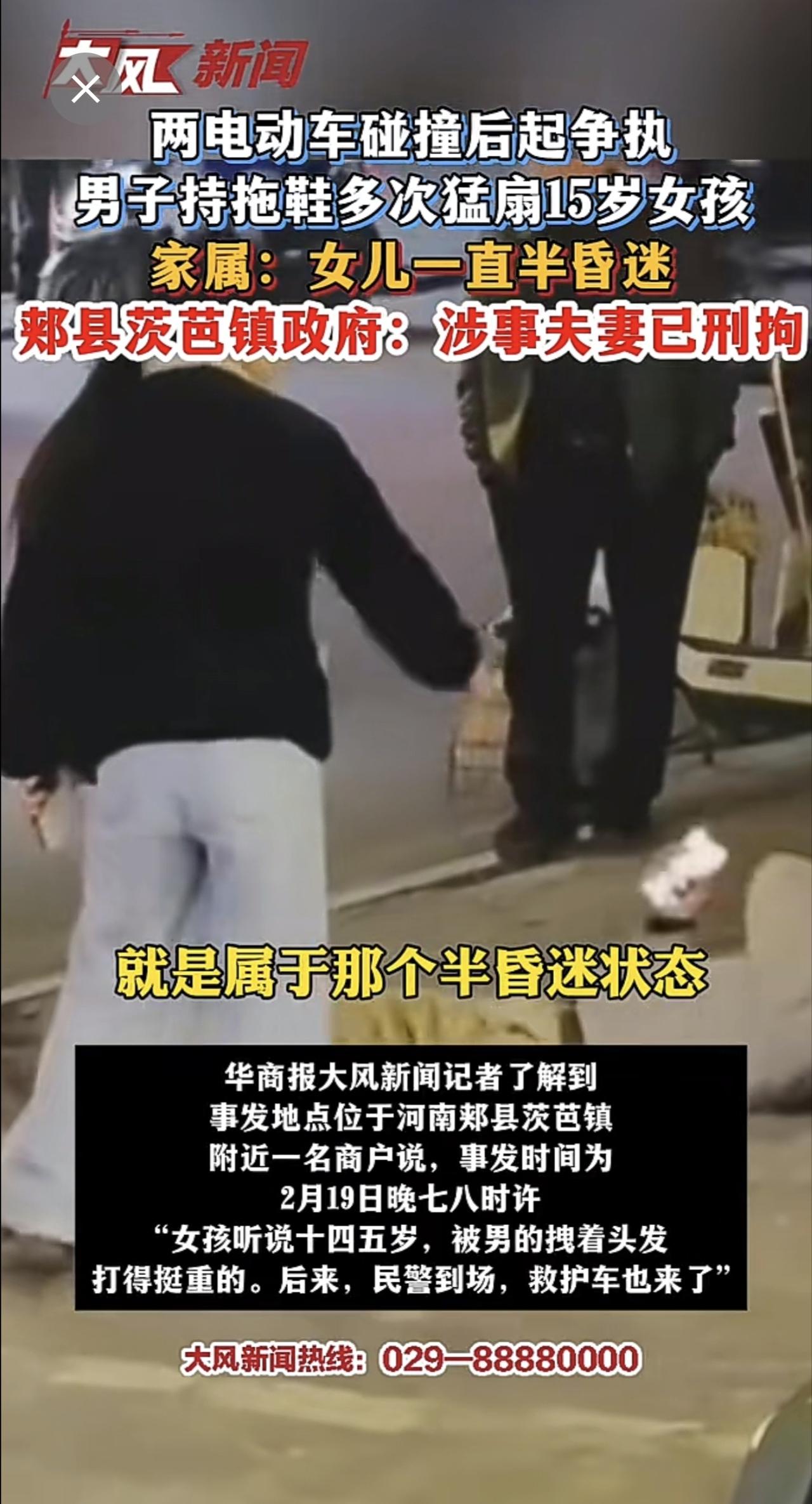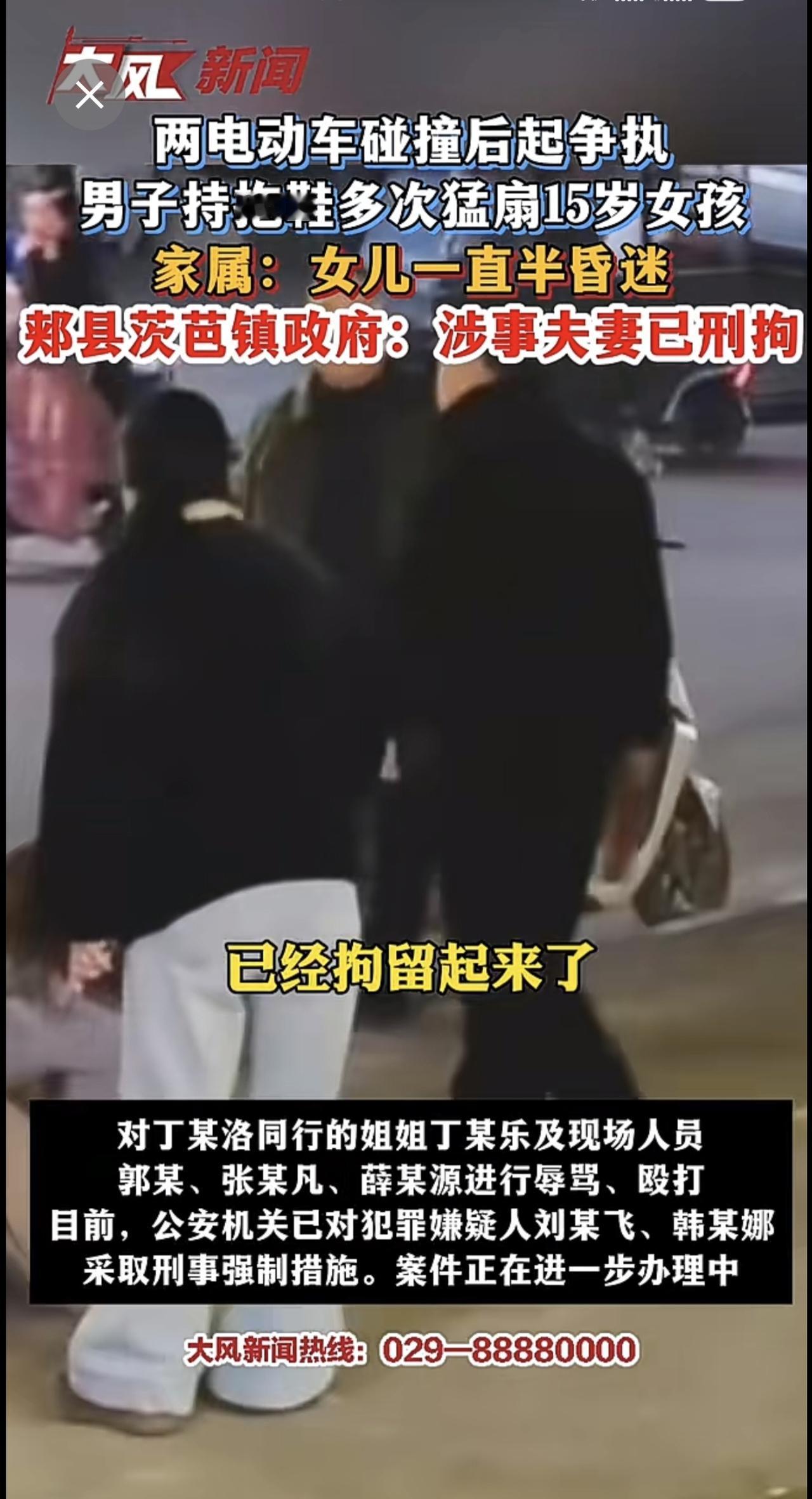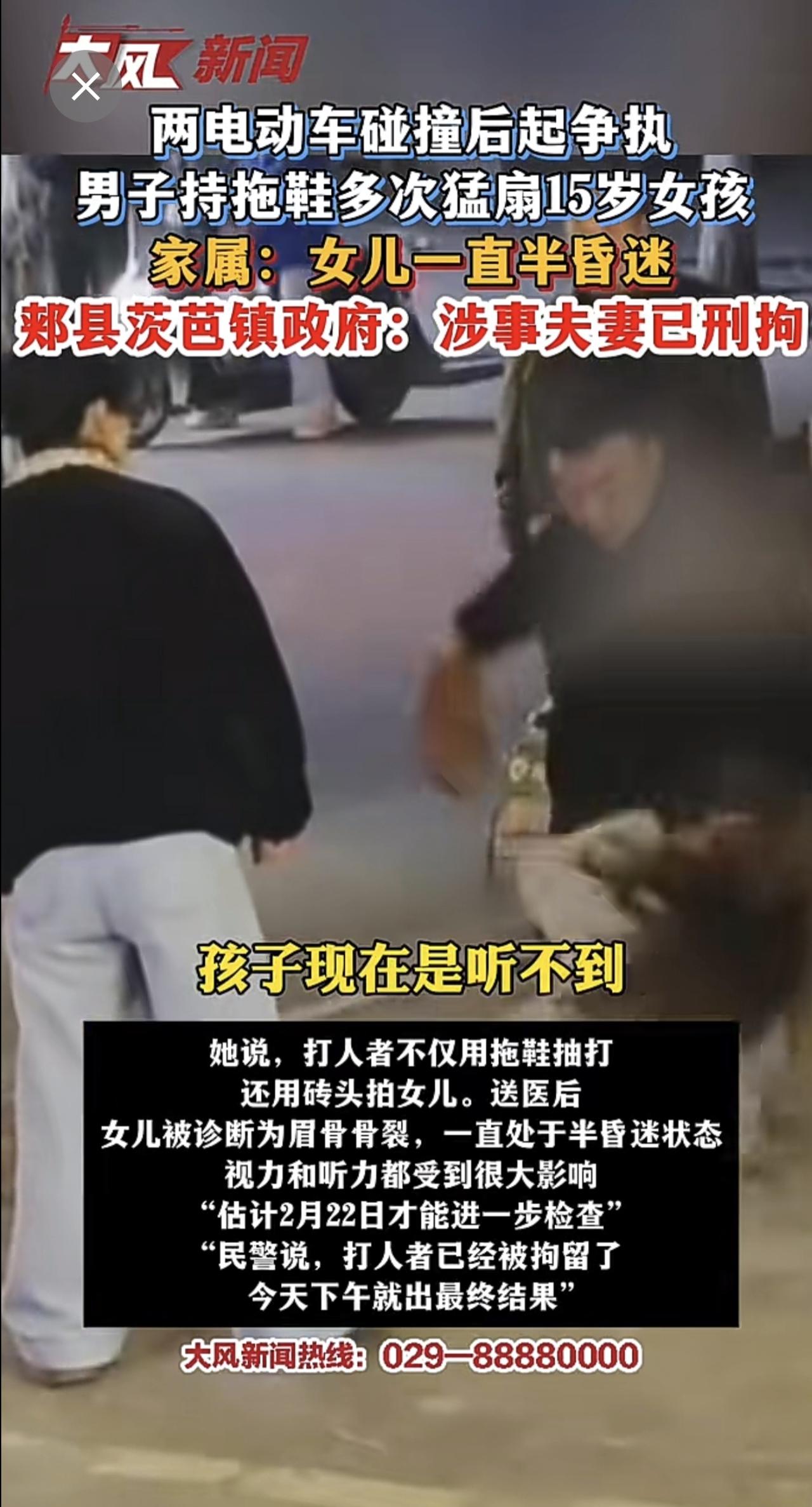 两电动车碰撞后起争执 男子持拖鞋多次猛扇15岁女孩 家属:女儿一直半昏迷 郏县茨芭镇政府:涉事夫妻已刑拘