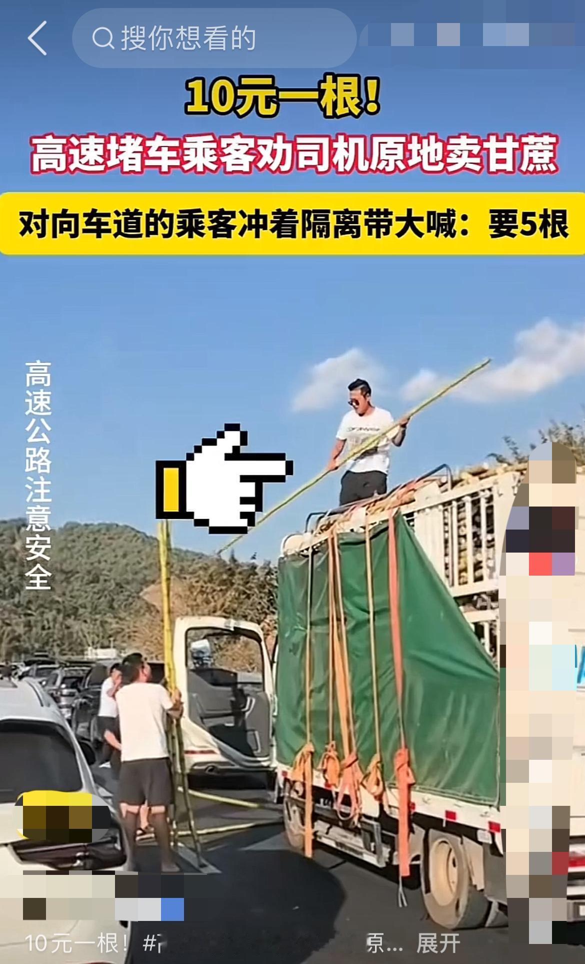 堵车堵出商机?高速卖甘蔗10元一根遭疯抢! "师傅,这甘蔗要不就地卖了吧?"