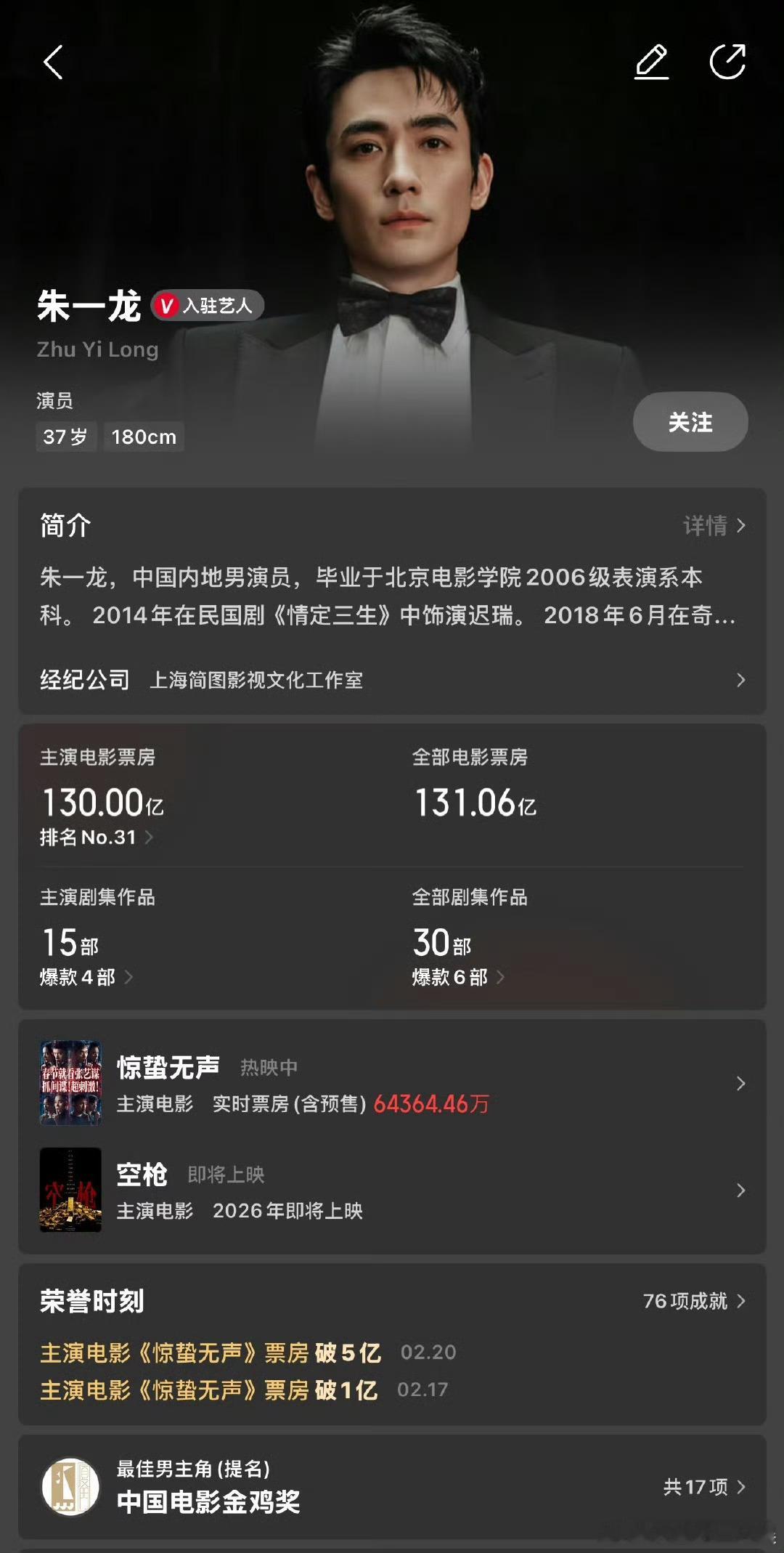 朱一龙朱一龙主演电影票房破130亿 据猫眼专业版数据,朱一龙主演电影《惊蛰无声》正在热映,助力朱一龙主演电影票房突破130亿!春节档马上有戏电影惊蛰无声