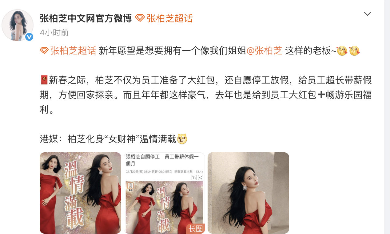 张柏芝让员工带薪休假一个月张柏芝给员工发超大红包 据港媒,张柏芝今年宠员工超大手笔!不仅派发超大红包,还直接停工,让员工带薪休一个月长假安心过年,妥妥的 “女财神” 本神,也太让人羡慕了吧