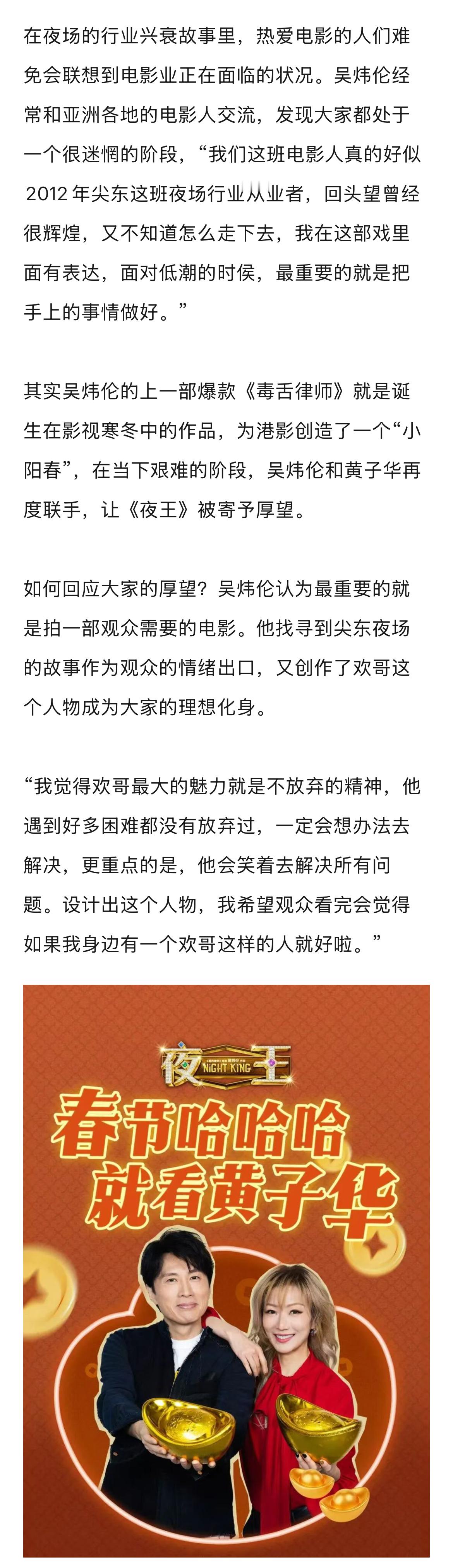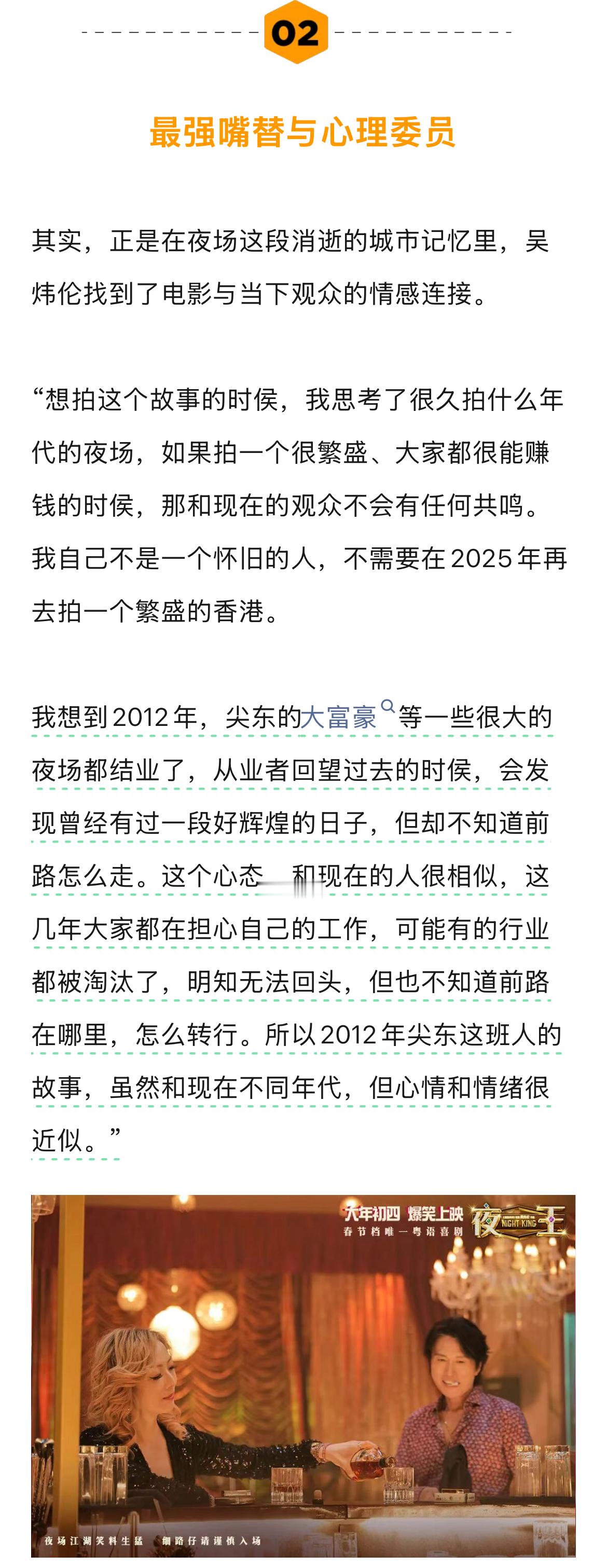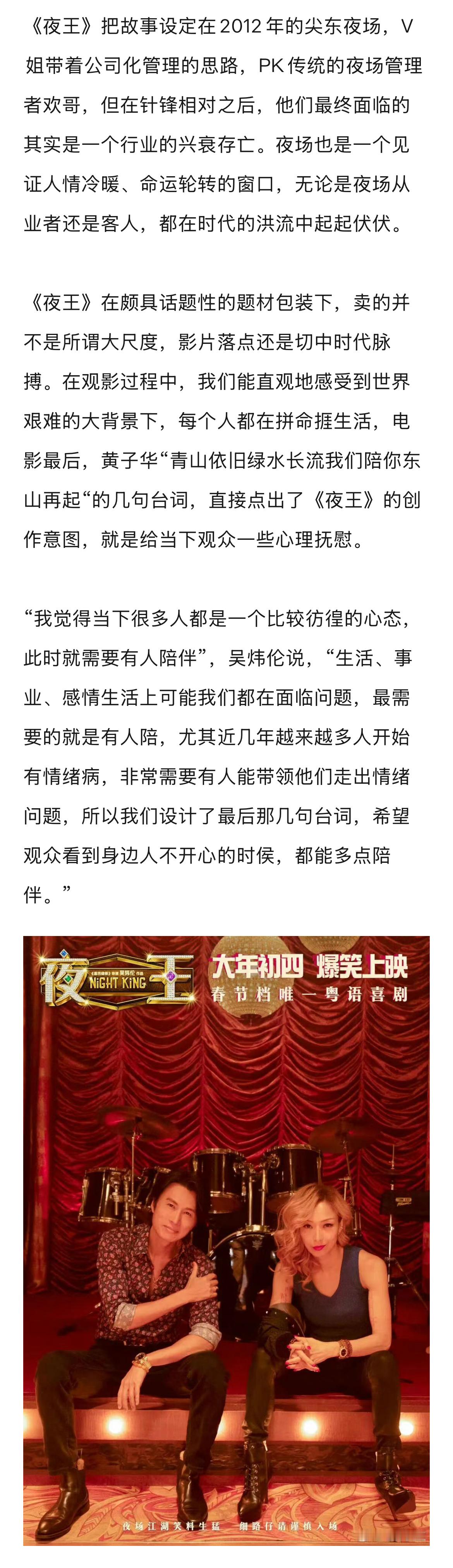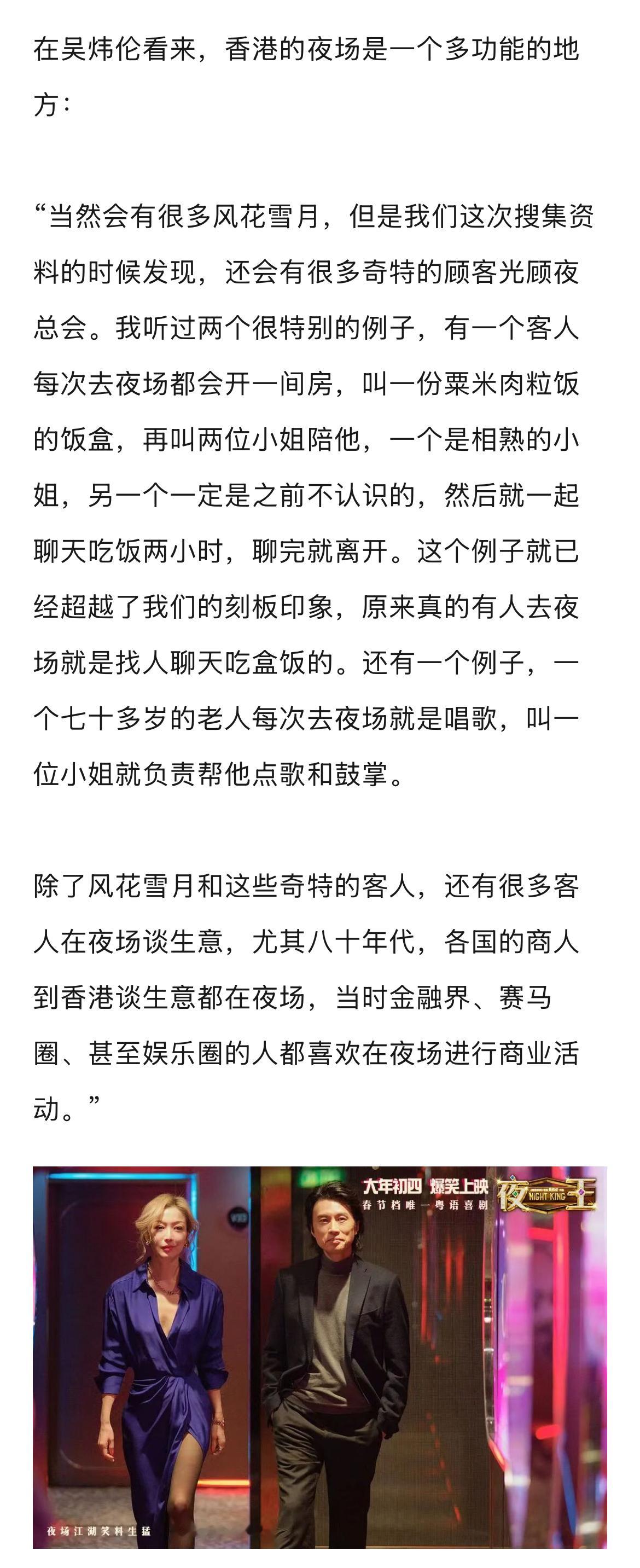 夜场题材在香港电影史上不是新鲜事,港影为何热衷于拍这类故事?在导演吴炜伦看来,香港的夜场是一个多功能的地方:“除了风花雪月和奇特的客人,还有很多客人在夜场谈生意,尤其八十年代,各国的商人到香港谈生意都在夜场,当时金融界、赛马圈、甚至娱乐圈的人都喜欢在夜场进行商业活动。”《夜王》在颇具话题性的题材包装下,卖的并不是所谓大尺度,影片落点还是切中时代脉搏。比如电影最后,黄子华“青山依旧绿水长流我们陪你东山再起“的几句台词,直接点出了《夜王》的创作意图,就是给当下观众一些心理抚慰。虽然是夜场题材,但电影没有过度消费女性。“现在时代变了,女性观众对于女性群像电影都有她们的要求,我肯定会去考虑”…娱理独家↓