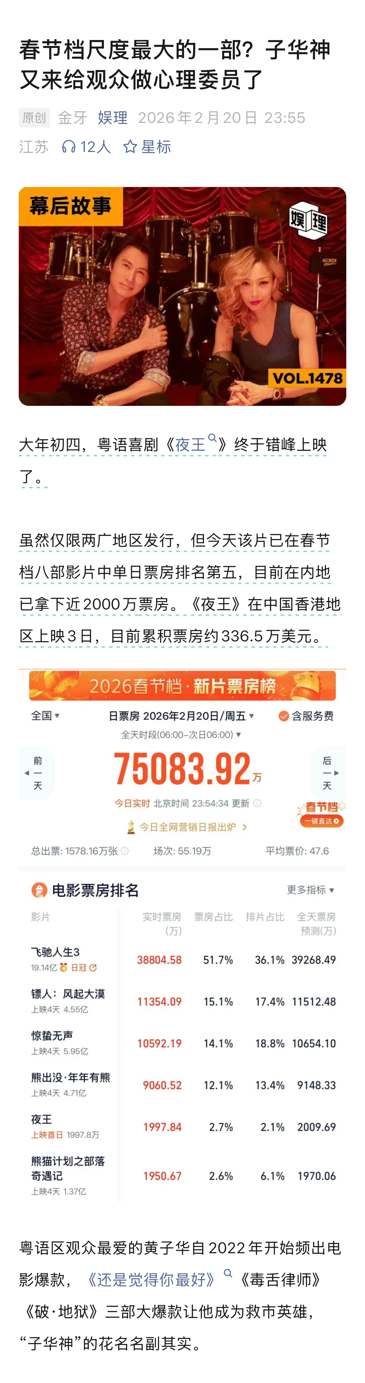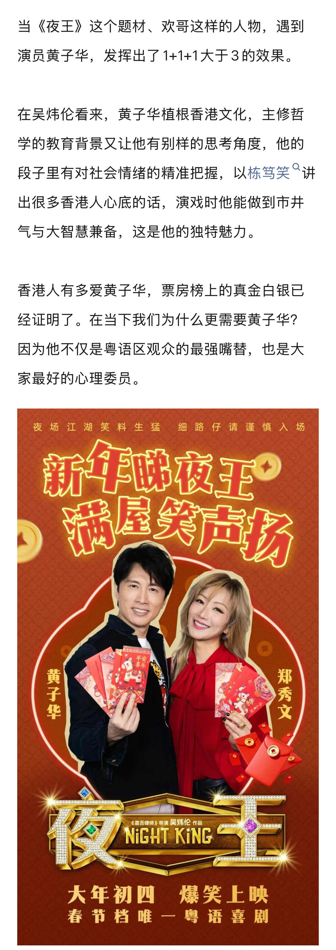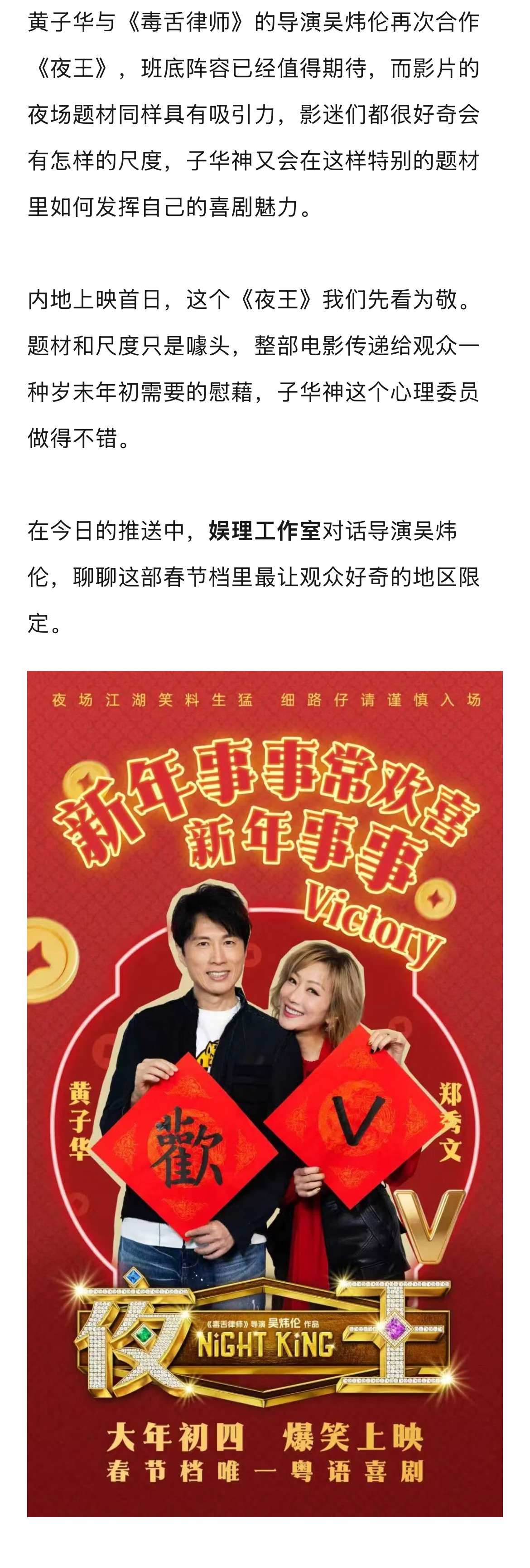 春节档需要夜王这样的喜剧夜王女性群像 粤语区观众最爱的黄子华自2022年开始频出电影爆款,《还是觉得你最好》《毒舌律师》《破·地狱》三部大爆款让他成为救市英雄,“子华神”的花名名副其实。黄子华与《毒舌律师》的导演吴炜伦再次合作《夜王》,班底阵容已经值得期待。
