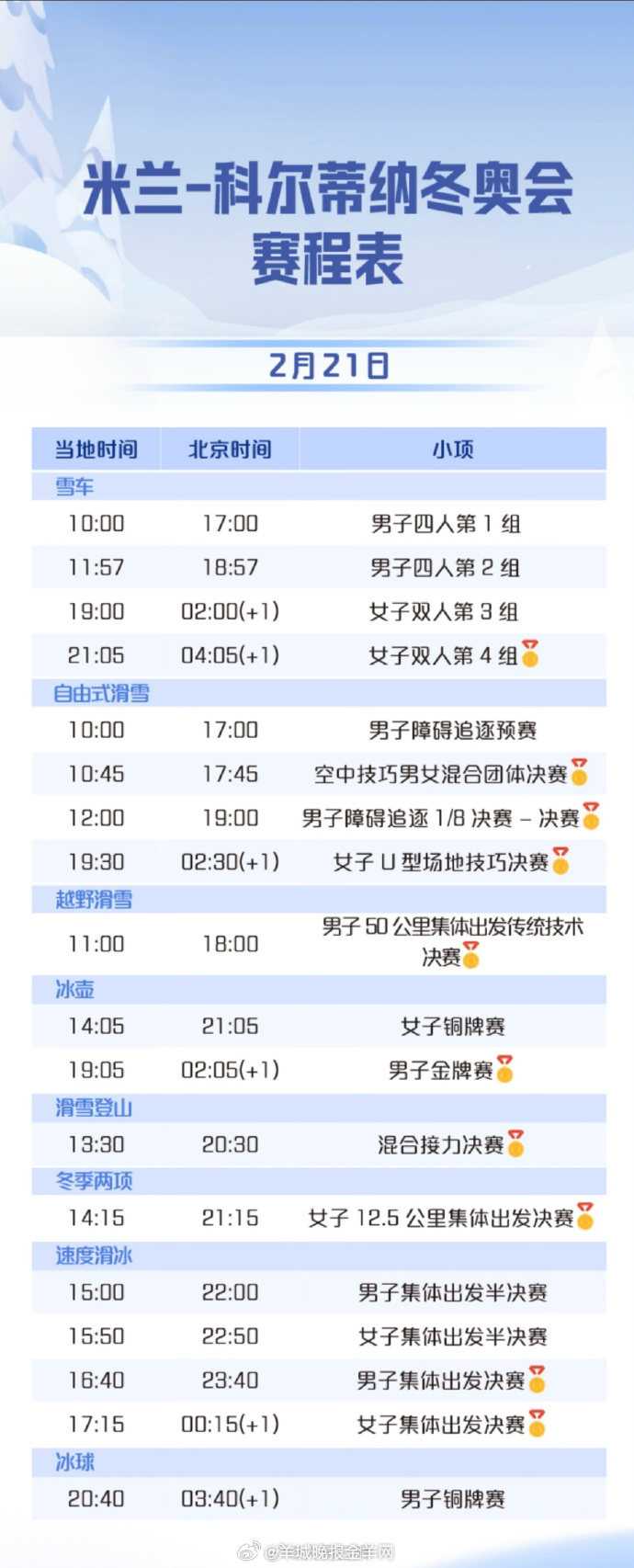【冬奥会每日看点:#桃心夫妇携手李天马冲金#】#谷爱凌李方慧等U型场地冲金# 米兰冬奥会21日进入倒数第二个比赛日,届时将产生10枚金牌。当日最大看点依旧在自由式滑雪,中国队的目标是两枚金牌。