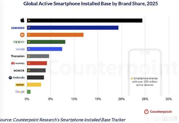 Counterpoint Research调查的一份数据非常有趣,截止到去年年底,全球正在使用的智能手机,每四部手机都有1部是iPhone,苹果直接以25%的活跃设备存量份额位居全球智能手机第一的位置,其活跃设备数量突破了10亿台,这个属实有点夸张。