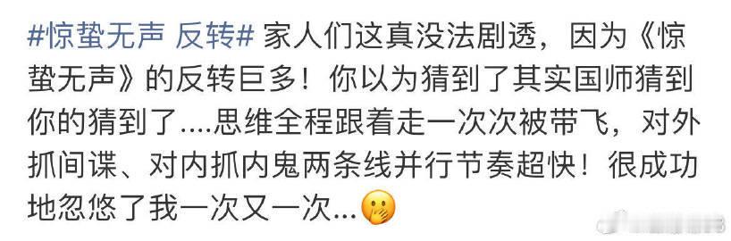 惊蛰无声别跟中国人玩心眼子 《惊蛰无声》这反转剧情太带劲了!对方自以为聪明埋钉子,却不知我们早有防备,反将一军。咱中国人玩心眼子那可是有悠久历史的,从《孙子兵法》的“五间”之法,到各种经典战役的谋略运用,这经验值直接拉满,谁敢来比?