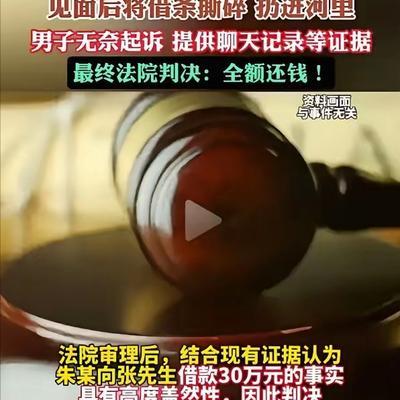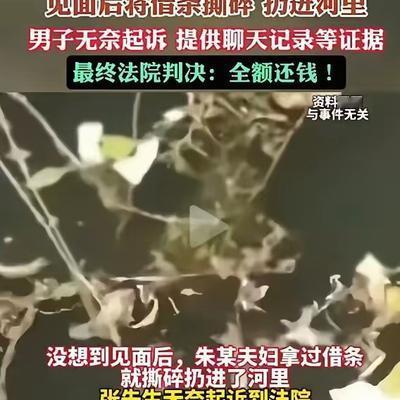 人心险恶!南京一男子借给好友30万现金,万万没想到好友妻子称准备还钱,但要先看看借条,趁机将借条撕碎扔进河里!男子无奈起诉,而法院的判决亮了! 张先生到现在都在懊悔,自己一时心软,竟被几十年发小联手妻子算计。 而朱某夫妇被二审驳回上诉后彻底慌了,多次上门恳求私了,愿少还5万。 张先生看着他们低声下气的模样,只觉可笑恶心,当场果断拒绝。 他忘不了两人撕借条时的无赖嘴脸,更忘不了取证维权的艰难日子。 这场私了拉扯,是他被骗经历中最不齿的一段插曲。 朱某常年经营小生意,看似风光,实则早已负债累累、拆东墙补西墙。 2017年,他无力周转,第一个想到了家境尚可、待人诚恳的发小张先生。 他伪装憔悴无助,上门哭诉生意失利,求张先生借钱应急。 张先生念及发小情谊,毫无怀疑,当场取出积蓄以现金借给朱某。 两人立下借条约定一年后还款,张先生从未想过这是被骗的开端。 朱某从一开始就没打算还款,借条不过是暂时的幌子。 还款日期一到,朱某便刻意躲避,电话不接、消息不回,踪迹难寻。 张先生多次主动联系,均被敷衍拖延,心里渐渐泛起不安。 可他仍不愿相信,几十年发小会故意欺骗自己,始终抱着一丝希望。 2019年,朱某带着妻子再次上门,苦肉计比上一次更逼真。 两人轮番哭诉,说再借一笔就能盘活生意,两笔钱一起还清。 张先生心软了,不顾家人劝阻,再次凑钱借出,两笔合计30万。 补签借条时朱某夫妇信誓旦旦,可承诺仅维持几个月,朱某便再次消失。 直到被拉黑联系方式,张先生才彻底清醒,自己从头到尾都被算计了。 他四处打听朱某下落,辗转多地却一无所获,30万欠款仿佛石沉大海。 就在他准备通过法律维权时,朱某的妻子突然主动联系他。 她态度热情诚恳,说家里资金问题已解决,让张先生带借条见面核对转账。 绝望中的张先生卸下防备,小心翼翼收好借条,按时赴约河边。 可他刚拿出借条,朱某夫妇就瞬间变脸,笑容消失得无影无踪。 朱某一把夺过借条,妻子快速将其撕成碎片,狠狠扔进旁边河里。 “没借条了,谁能证明我们欠你钱?这30万就当你送我们的!” 冰冷无赖的话语,让张先生当场愣住,反应过来后打捞已来不及。 纸屑被水流冲得无影无踪,只剩他一人在河边满心愤怒与绝望。 这是他被骗经历中最刻骨铭心的一幕,毕生无法忘怀。 朱某夫妇计谋得逞后转身就走,还不忘威胁张先生不准闹事。 看着两人背影,张先生反而冷静下来,决心用法律讨回公道。 他当即用手机拍摄现场碎片,联系了当时在场的目击者。 回家后,他翻出与朱某的聊天记录,梳理出两次借款的详细细节。 他找到陪同取现金、借钱的亲友,收集到关键证人证言。 同时调取了两次取现金的银行流水,间接佐证借款事实。 集齐所有证据后,张先生正式向南京当地法院提起诉讼。 庭审现场,朱某夫妇态度强硬,死不承认借款和骗钱事实。 他们反复辩称借条已销毁,无直接证据,企图逃避法律责任。 法官逐一核查证据,形成完整证据链,一审认定借款事实成立。 法院责令朱某夫妇限期还清30万,两人不服判决,提起上诉。 二审法院重新核查案件细节,最终驳回上诉、维持原判。 直到这时,朱某夫妇才真正慌了,于是有了开头上门私了的一幕。 张先生的拒绝,既是讨回公道,也是警醒自己不再轻信他人。 如今判决已生效,朱某夫妇不得不四处借钱,凑齐30万还给张先生。 他们因恶意骗钱、销毁证据,被纳入失信被执行人名单,出行贷款处处受限。 朱某的生意彻底倒闭,负债累累、名声扫地,成了人人指责的骗子。 他的妻子也因这场骗局与他争吵不断,最终离婚收场、家破业败。 几十年发小情谊彻底毁灭,两人再无往来,成了彼此的陌生人。 张先生拿回欠款后放下心头大石,却也因被骗经历留下了心理阴影。 他常给身边人讲述自己的被骗经历,提醒大家借贷需谨慎、留存好证据。 一场30万的借款骗局,看清了人心,也给所有人上了堂法治课。 金钱考验人心,诚信才是立身之本,骗钱赖账终将难逃法律严惩。 信息来源:光明网——男子向朋友借30万元为赖账撕碎借条,被判还钱