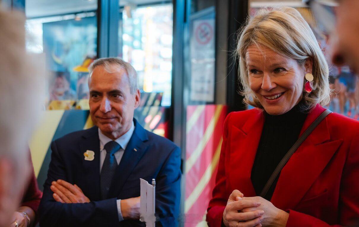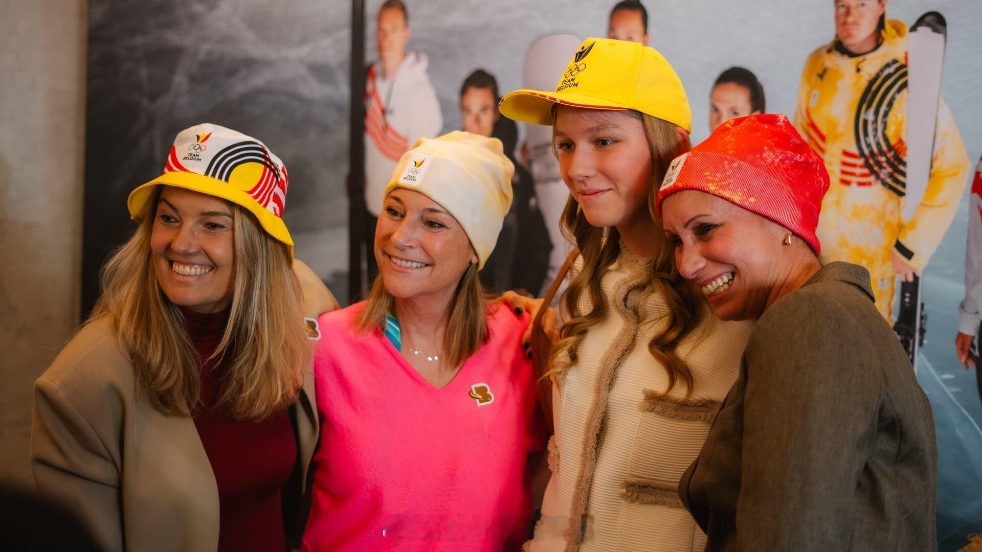2.20 比利时国王菲利普、王后玛蒂尔德和小女儿埃莉诺去冬奥村与运动员寒暄互动玛蒂尔德红裤装来自Dries Van Noten,埃莉诺白色外套来自Emporio Armani