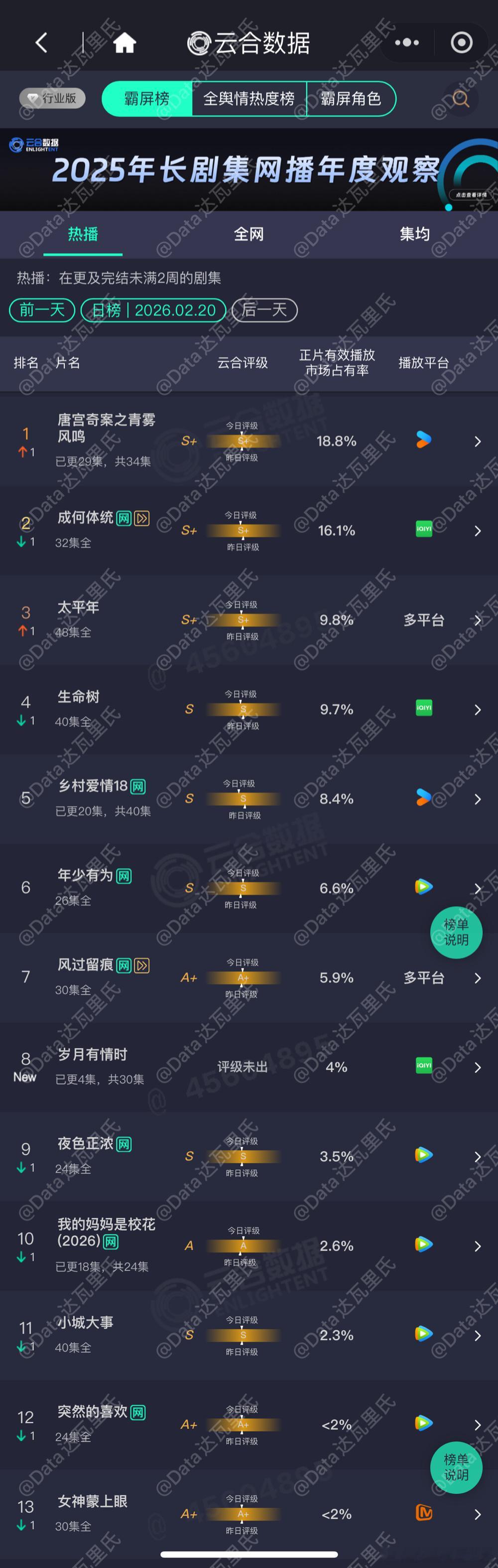 2.20云合占比唐宫奇案 18.8%重新登顶成何体统 16.1%太平年 9.8%生命树 9.7%岁月有情时 首播云合4%,560万上下