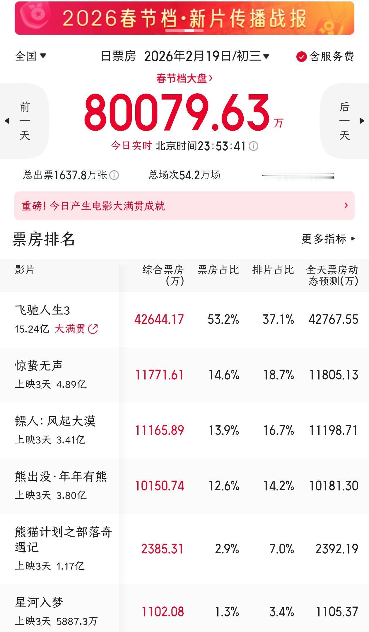 初三票房,《飞驰人生3》用4.26亿,把整个档期撕成了两半。 一边是它独占53.2%的江山,另一边才是其他所有电影。 你算算,全国8个亿的票房,每秒都在往池子里扔近一万块钱。1637.8万张票根,意味着那天全国的检票口,人潮几乎没断过。 平均48.8元的票价,你以为是看场电影,其实不过是一杯高端奶茶的钱,这成了春节最便宜的集体狂欢。 但狂欢里也有残酷的折叠。 韩寒的赛车第三次冲线,排片37.1%,却砍下过半票房,意味着它的影厅座无虚席。 而其他破亿的选手,《惊蛰无声》靠悬疑稳住心智,《镖人》靠刀光满足眼睛,《熊出没》则牢牢抱紧了每一个孩子的周末。 至于票房千万级的影片,在排片仅个位数的夹缝里,呼吸都显得奢侈。 这哪里是春节档,这是一场精确到秒的注意力战争。 拼的不是导演,是命;抢的不是票房,是人心。 电影市场,永远需要新的故事。