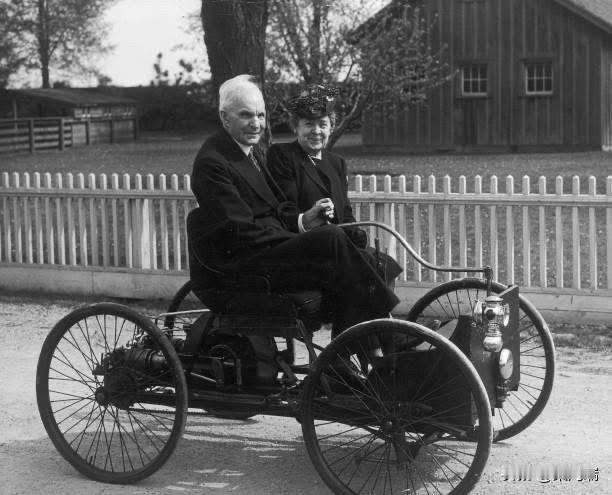 亨利·福特和他的妻子克拉拉·福特坐在福特四轮车里。福特于1896年制造了这款汽油动力、四马力的四轮车,这是他的第一辆成功的汽车。