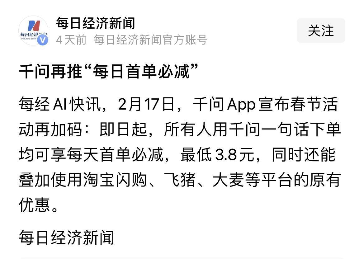 千问春节活动再加码,值得每一个人关注! 今年的春节千问妥妥的是一匹“黑马”,春节大免单直接引爆了整个网络,让全民都开始用AI购物。 而值得一提的是,千问的大动作不止于此,前几天千问再次对春节活动进行了加码,官宣从2月17日起,所有人用千问一句话下单都能享每天首单必减,最低3.8元起,还能叠加淘宝闪购、大麦等平台的原有优惠。 仔细了解了一番,这一次加码的每天首单必减活动,主要有三个重点。 第一,参与感拉满,因为这一次的每天首单必减活动,每天第一单都能享受立减,换句话说,只要每天用千问买东西,天天都能省钱。 第二,立减金额够大,每天第一单就直接立减,最低3.8元。而事实上,很多人立减金额都高达8.8元,这换算过来相当于一顿早餐了。 也就是说,咱们每天只要用千问来办事,每天都有可能省一个早餐钱,你说香不香? 第三,没有套路,下单后在支付时直接会弹出随机的立减金额,不需要咱们额外的操作,而且还能叠加原有的优惠使用,不会有冲突,是实实在在的加码,给我们省钱。 只能说,千问的魄力确实很大啊。 当然了,这也不奇怪,毕竟千问搞这些一直都不只是为了拉拉新用户这么简单,更重要的是想让大家养成用AI办事的习惯。 正如千问总裁吴嘉说,千问的目的是让AI真正进入每一个普通老百姓的日常生活中。
