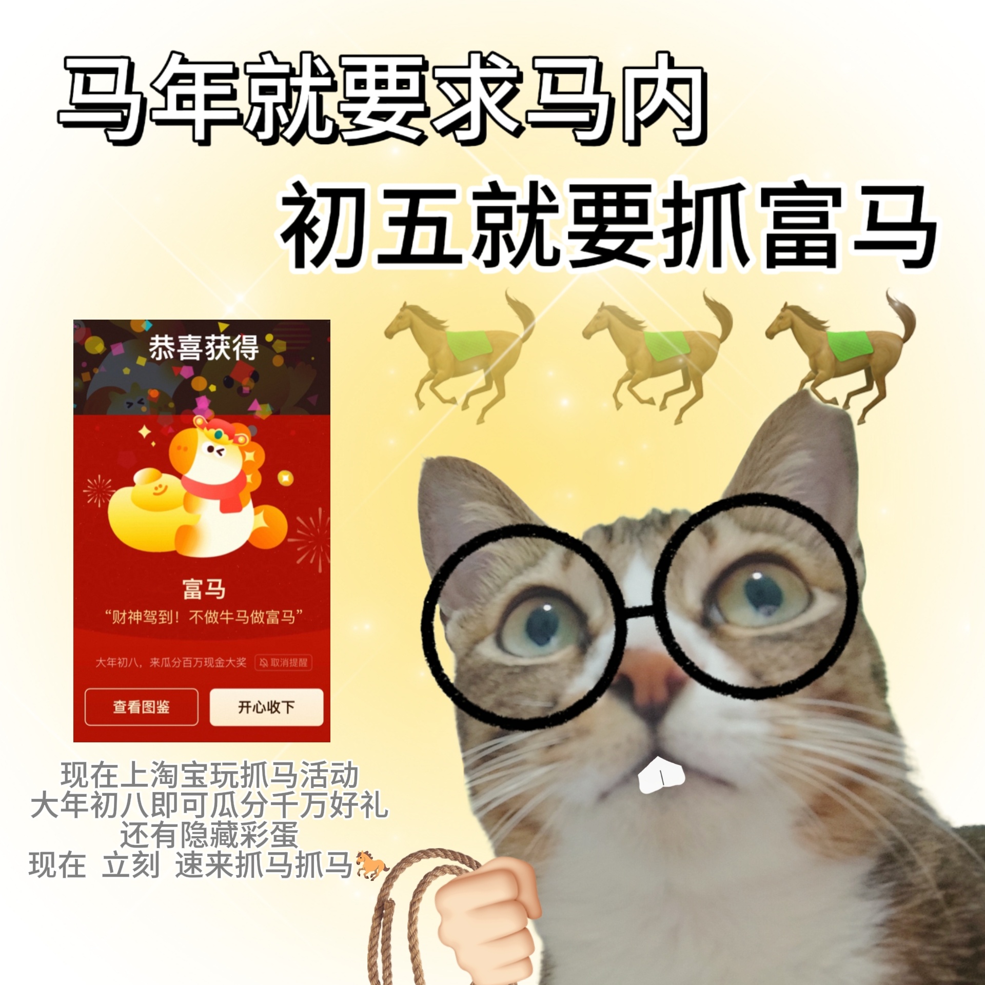 初五的财神有多忙 马年特色花活又+1!今年初五不迎财神,流行抓富马!2月10日-2月24日,上淘宝搜索【淘宝抓马】,参与抓马游戏,就有机会黄金和瓜分千万奖励,马年马上来财~ 上淘宝抓马淘个好彩头不必多说,初五抓富马,gogogo~