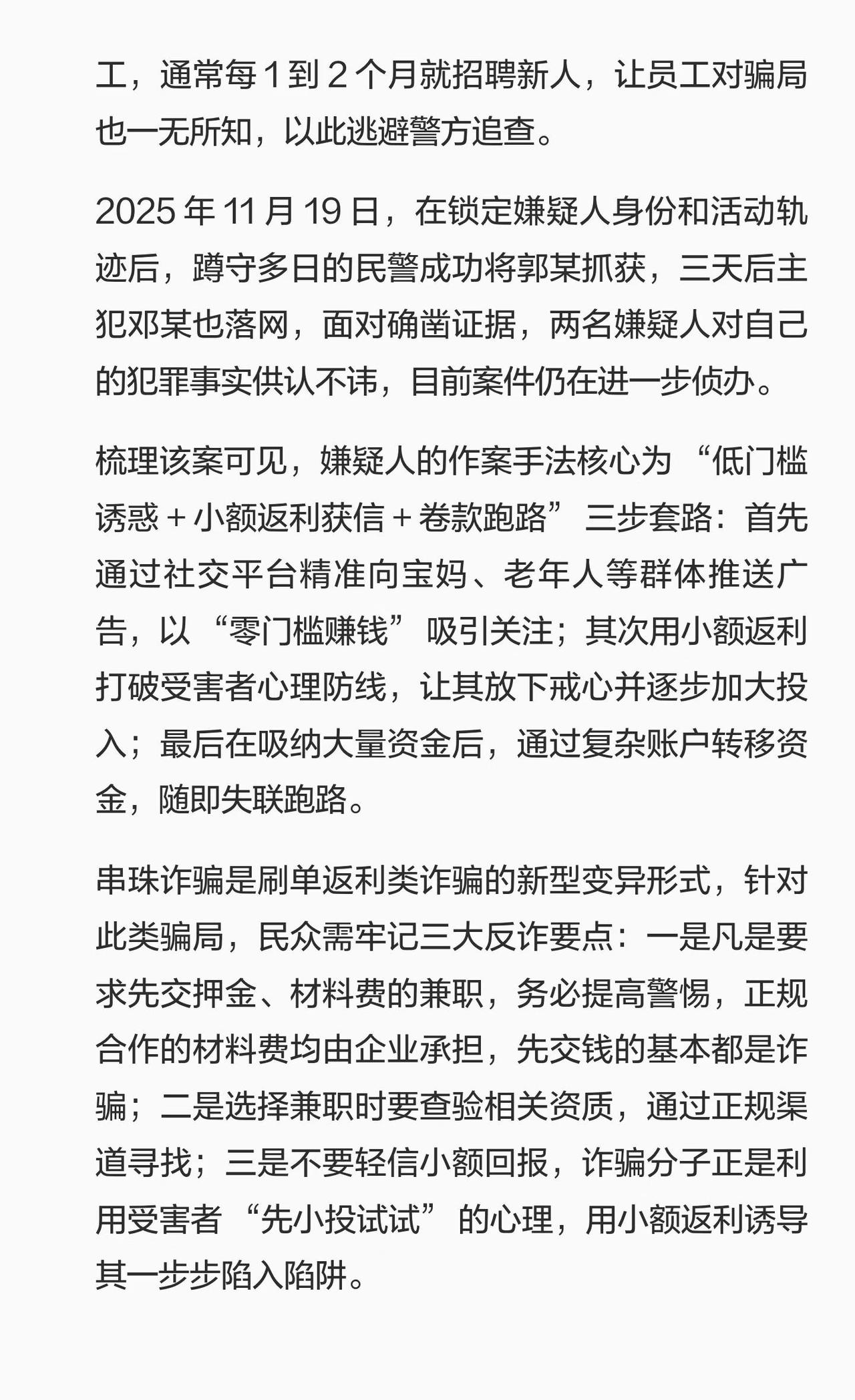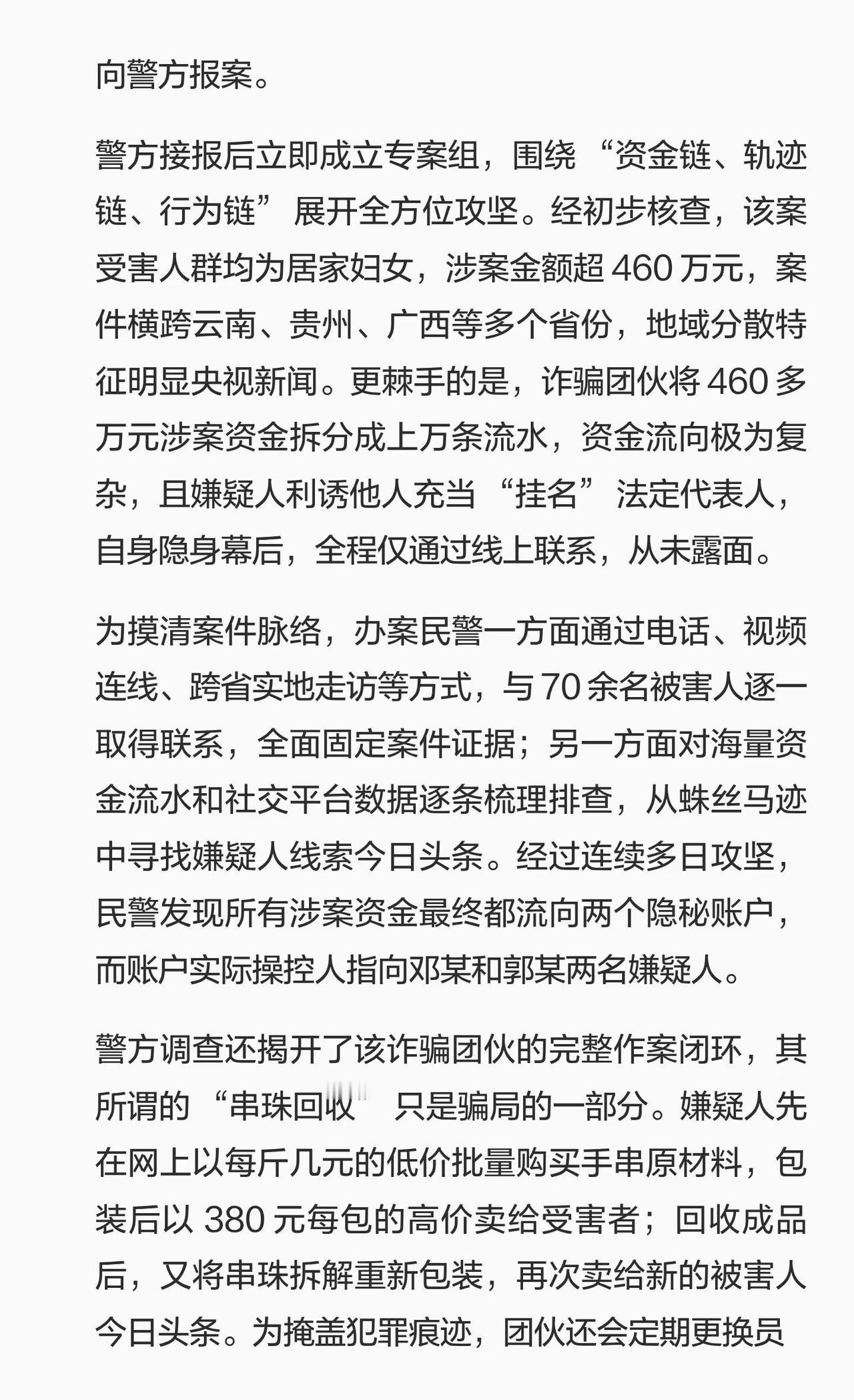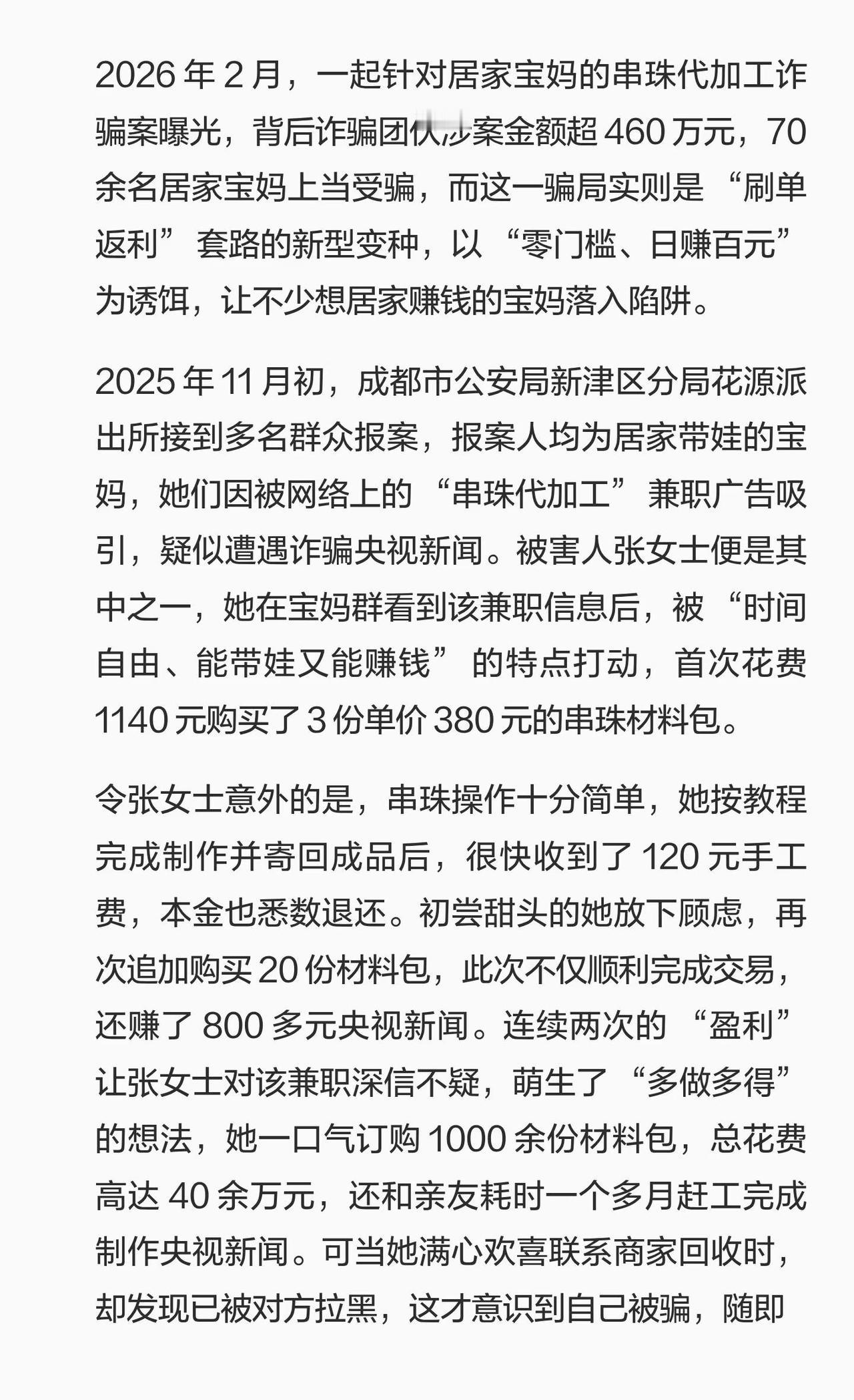 串珠兼职骗局!70 宝妈被骗 460 万 2026 年 2 月,一起针对居家宝妈的串珠代加工诈骗案曝光,背后诈骗团伙涉案金额超 460 万元,70 余名居家宝妈上当受骗,而这一骗局实则是 “刷单返利” 套路的新型变种,以 “零门槛、日赚百元” 为诱饵,让不少想居家赚钱的宝妈落入陷阱。未成年反诈指南 红薯地反诈指南 反诈开学第一课 远离诈骗陷阱 反网络诈骗 反电信诈骗 避免上当受骗