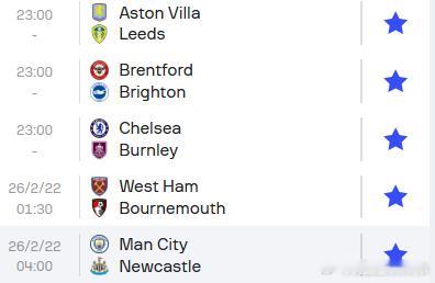 23:00 切尔西vs伯恩利 04:00 曼城vs纽卡斯尔联