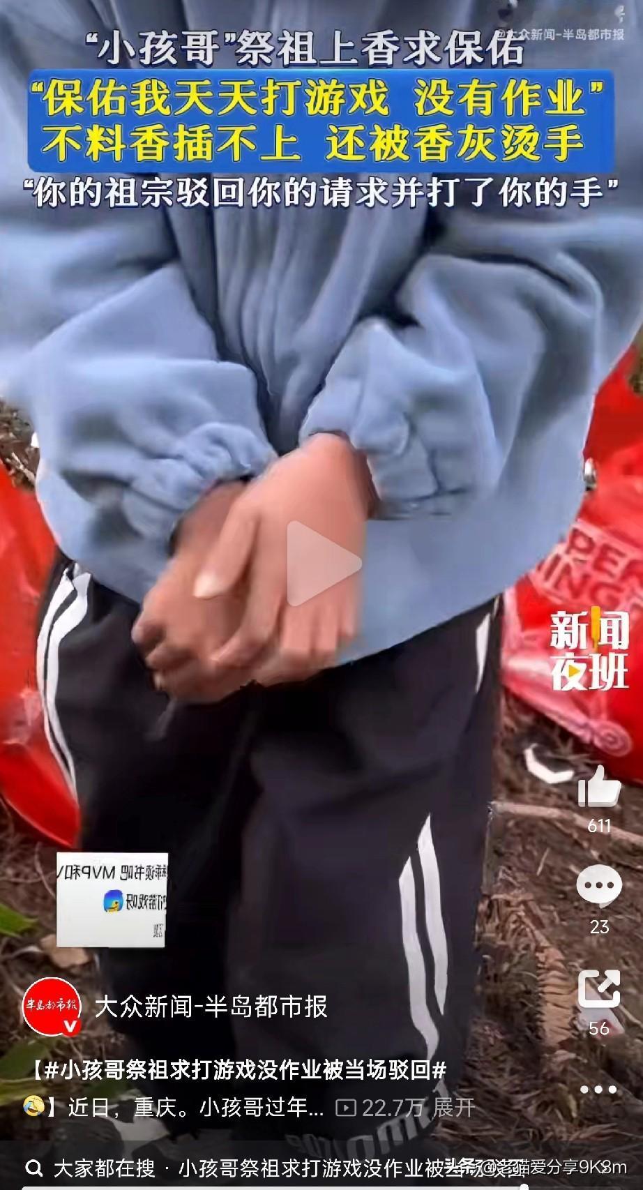 不写作业想打游戏,老祖宗都不答应 重庆一小孩哥过年祭祖名场面曝光, 大过年祭祖现场,小孩哥有模有样上香祈福,嘴里念念有词:“祖宗保佑我天天打游戏,局局MVP!还要保佑我天天没作业!” 结果刚要把香插进香炉,“啪嗒”一下香没立住掉地上了,手还被香灰烫了个正着! 这波操作直接让围观大人哭笑不得,网友更神评论:“祖宗在天有灵,直接驳回请求还附赠一记‘爱的铁砂掌’!” 网友热评: “这小孩怕不是游戏打魔怔了,连祖宗都敢‘走后门’!” “心疼又好笑,看来想打游戏还是得靠自己练技术啊~” “没作业?祖宗:想得美!好好学习才是正事!” “建议下次求保佑‘考试100分’,说不定香灰都变成金元宝掉下来!” 小孩哥这波操作属实是“求神不成反被烫”,看来打游戏和免作业这种“美事”,连祖宗都不答应啊! 不过话说回来,小孩子天真可爱的愿望虽然搞笑,但也提醒咱家长:与其让孩子指望“神仙保佑”,不如培养好习惯,脚踏实地学习、适度游戏,才是正经事! 求神拜佛不如靠自己,好好学习才能“buff加满”呀~