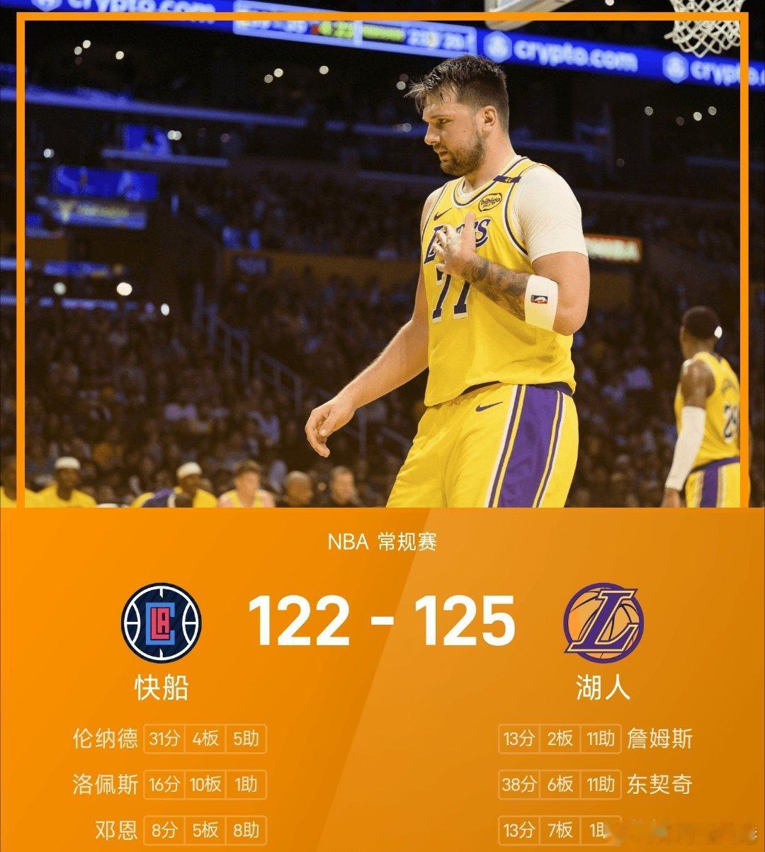 湖人战胜快船nba 湖人125-122战胜快船。东契奇砍下全场最高的38分6板11助,率领湖人成功取胜,伦纳德得到全队最高31分但末节伤退。