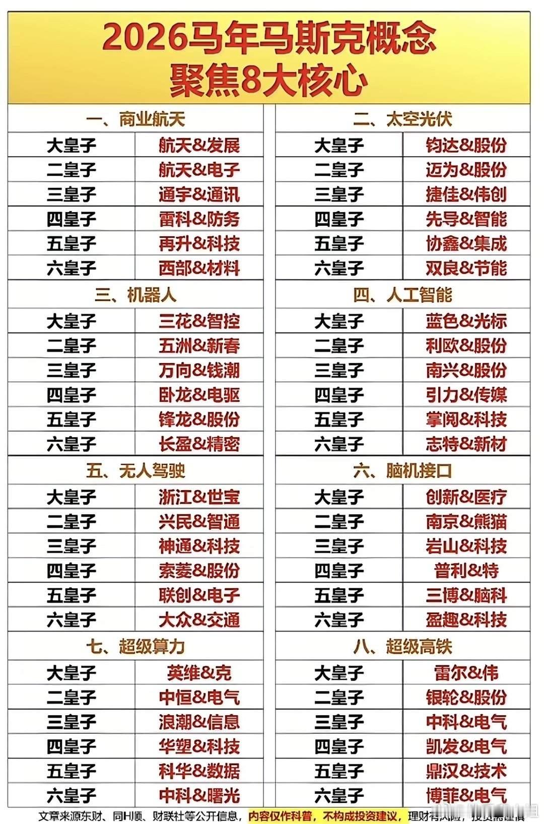 马年开年,在马斯克旗下公司密集消息催化下,A股相关概念迎来爆发。以下是八大核心赛道的投资逻辑与核心标的梳理:2026关注马斯克财神