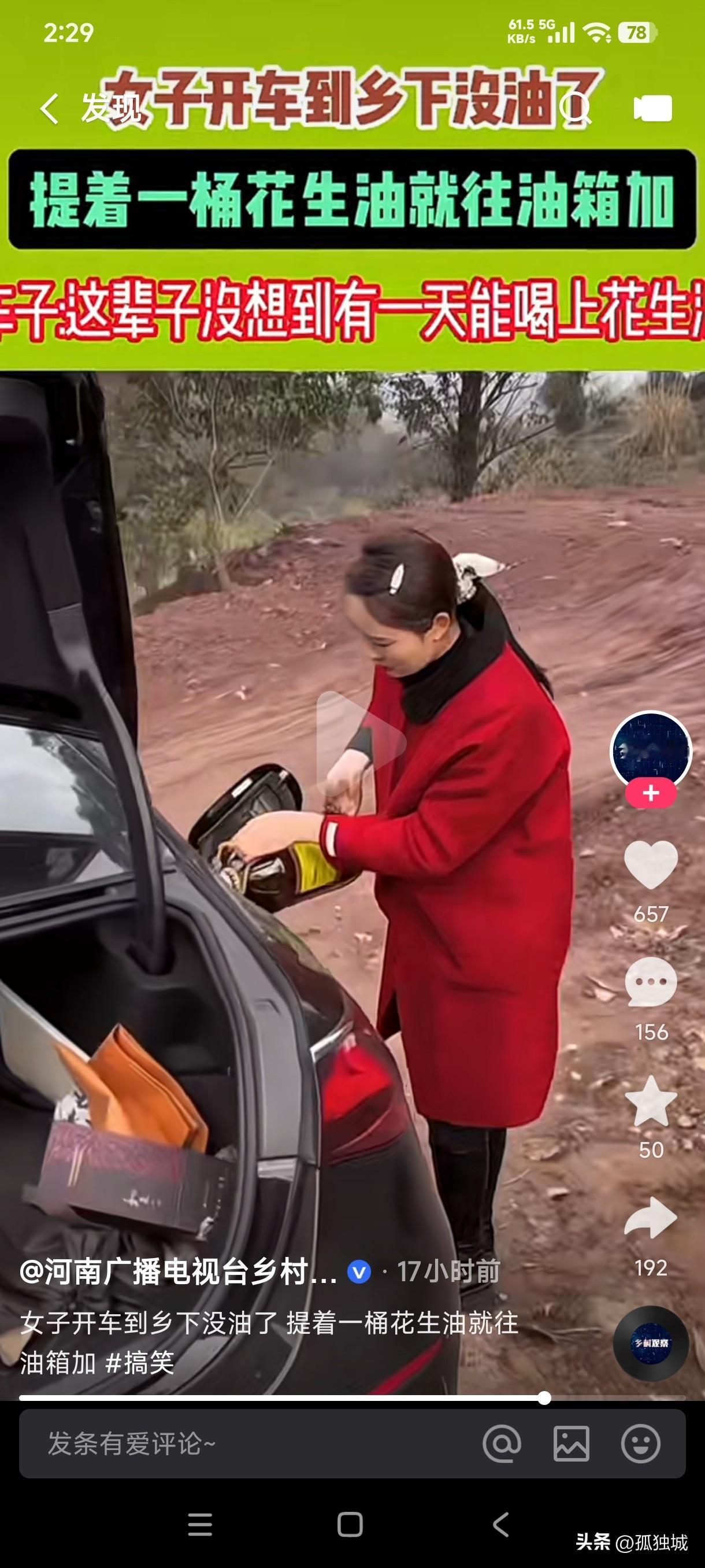 现如今这拍段子的成本这么高了吗? 女子开车到乡下走到半道没油了,她居然打开后备箱提了一桶花生油就往油箱里面加,这花生油加在汽车油箱里面车也能跑吗? 这一幕真是让人开眼了,这花生油竟然还能当汽油使吗?这究竟是车子这辈子享福了?还是花生油的用途本来就广泛,不仅人可以炒菜食用,而且加在汽车油箱里车子也能跑,还能代替汽油使用,这花生油真的可以加在汽车油箱里面使用吗?我真的不敢相信这是真的,这如果加进去车子是不是就报废了?懂汽车常识的大神说一下这操作真的可行吗?