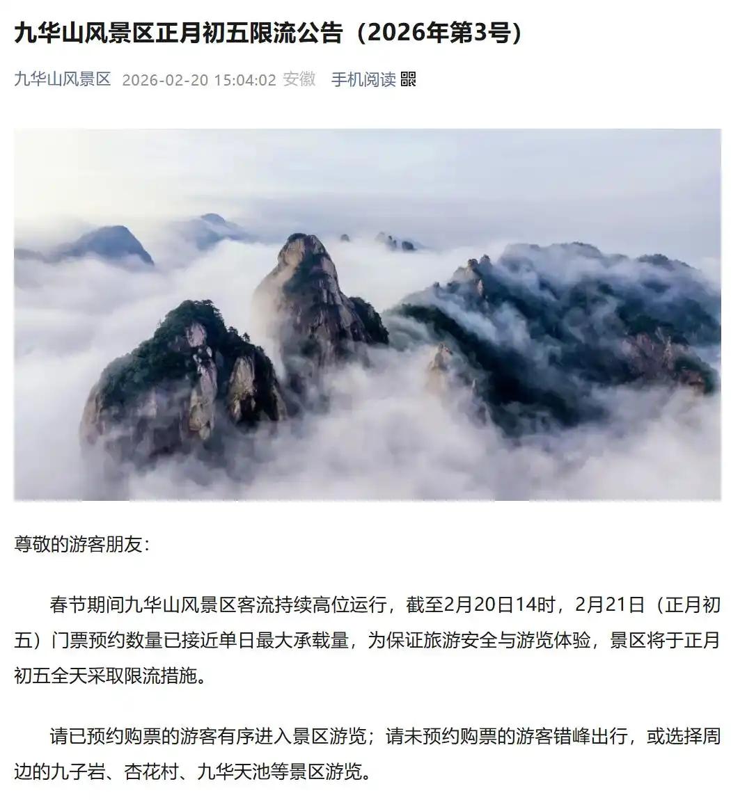 绝了! 2.21全国景区集体限流,有钱都进不去,太扎心 2月21日正月初五,九寨沟、泰山、洛邑古城全爆单,门票秒空、临时闭园、停止售票。 别再说“说走就走”,现在是预约不到、排队两小时、看景五分钟。 表面是旅游火爆,本质是大家憋坏了,报复性出游撞上假期尾巴,景区撑不住,游客更遭罪。 金句:风景再美,挤成肉饼也没心情;假期再香,抢不到票全是白忙。 股市点评:旅游、景区、酒店板块短期冲高,注意高位回落风险。 景区