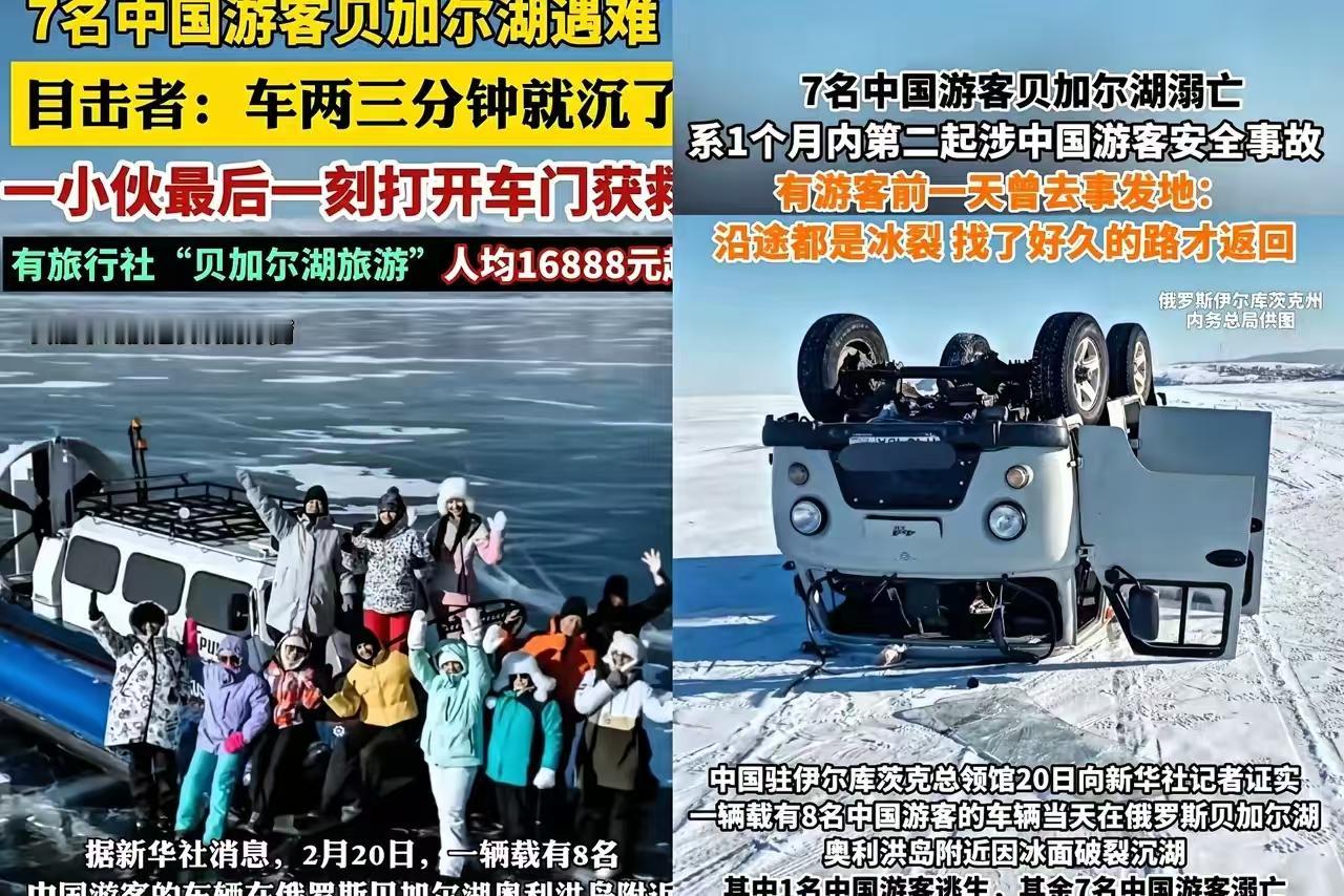 7名中国游客,在贝加尔湖溺亡,部分死者身份曝光,遇难者里有完整的一家三口,还有14岁的孩子,本该开开心心的旅行,却成了永远回不来的归途。这位幸存的丈夫,眼睁睁失去妻儿与亲人,往后的日子该有多煎熬。 官方通报来得沉重又清晰。当地时间2月20日,8名中国游客乘越野车在贝加尔湖奥利洪岛附近冰面行驶,冰面突然破裂,车辆坠入18米深湖水中,7人遇难仅1人幸存。 这不是意外,是本可避免的悲剧。当地气温异常偏高,2月最高温达13.8℃,冰面早已松动开裂,官方早已严禁车辆上冰行驶。 涉事司机无视禁令,执意驶入未开放冰面。目击者说,司机发现裂缝仍未及时停车绕行,短短几分钟,车子就沉入冰冷湖底。 遇难者里有完整一家三口,14岁孩子还没来得及看遍世界,就和爸妈一起永远留在异乡。团圆之旅,瞬间变成生死离别。 唯一活下来的丈夫,在最后一刻奋力逃出车门。他亲眼看着至亲沉入湖中,那种无力与绝望,刻进余生每一个日夜。 这已是一个月内当地第二起涉中国游客冰面事故。前一次已有人员伤亡,依旧没能挡住后来者踏上危险冰面。 境外自由行、小众打卡越来越火,很多人只顾拍网红照片,完全忽略当地警示与安全规则,把生命赌在看不见的风险上。 黑导游、私单司机钻空子,为了赚钱无视禁令,带着游客闯危险区域。他们赚的每一分钱,都踩在游客的安全线上。 中国驻当地总领馆已第一时间介入,协调救援、核实身份、安抚家属。可再及时的处置,也换不回7条鲜活的生命。 出门旅行,风景再美,比不上平安回家。蓝冰再惊艳,抵不过家人在门口等你吃饭的温暖。 别让一时冲动,毁掉几个家庭的一生。别让网红打卡,变成永远无法愈合的伤口。安全二字,从来不是口号,是回家的路。 各位读者你们怎么看?欢迎在评论区讨论。