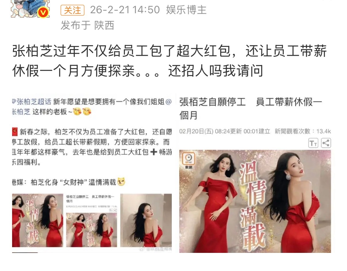 今天看到张柏芝年终给员工包超级大红包,还带薪休假一个月。其实之前就刷到她团队的人