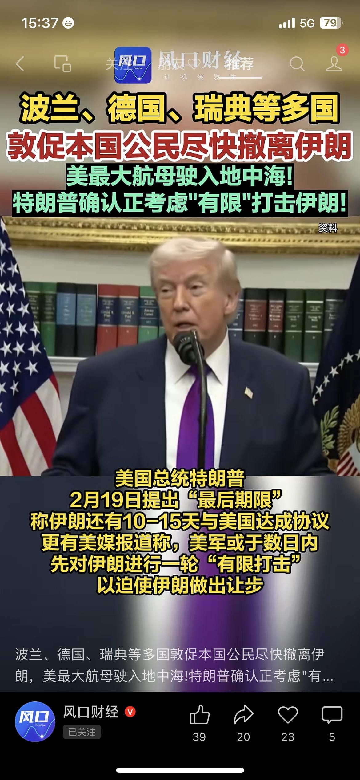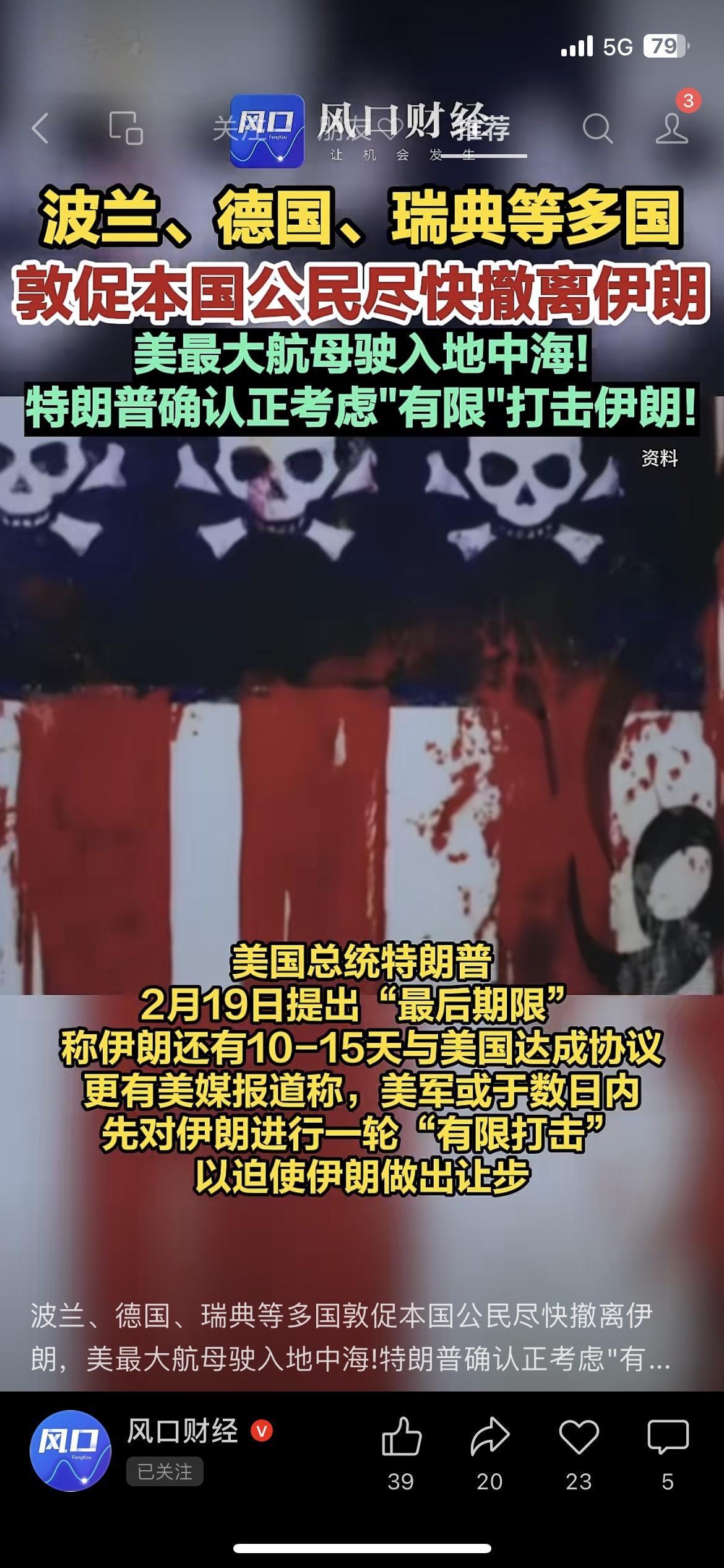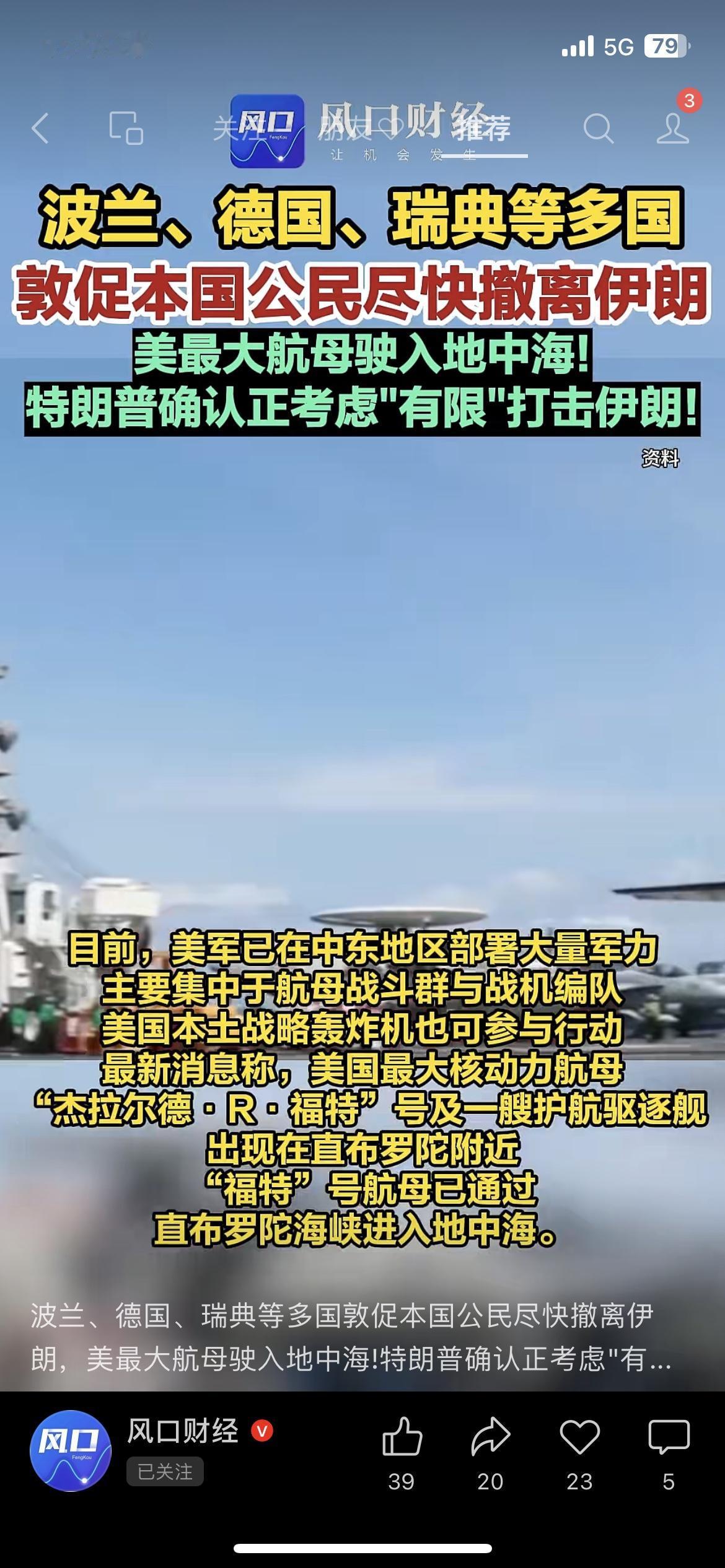 多国紧急撤侨!中东局势再度紧张 揪心! 波兰、德国、瑞典等多国突然发布提醒:敦促公民尽快撤离伊朗。 美国航母已驶入地中海,特朗普也表态:正在考虑有限打击。 中东这个火药桶,又被点燃了。 对普通人最直接的影响:国际油价、黄金、全球避险情绪全线波动。 大家最近多留个心眼,出门、出行、投资都稳一点。 你觉得这波局势会升级吗? 国际新闻 伊朗
