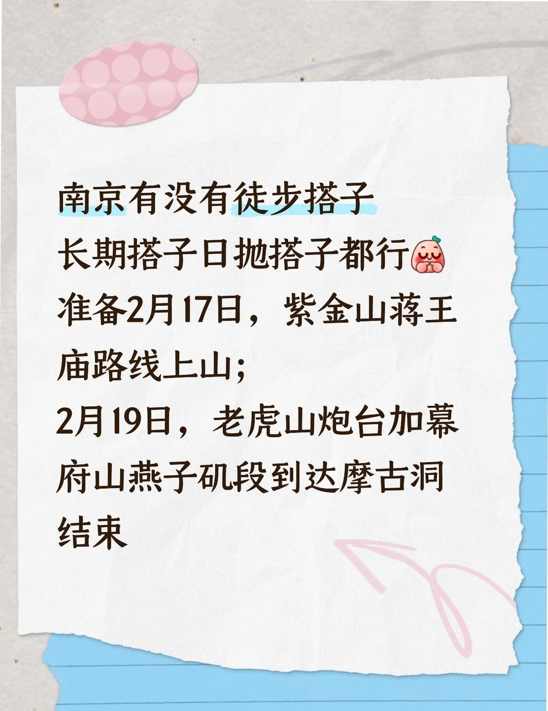 找个春节一起玩的搭子 南京有没有徒步爬山搭子, 长期搭子日抛搭子都行[害羞] 准备2月17日年初一,紫金山蒋王庙路线上山; 2月19日年初三,老虎山炮台加幕府山燕子矶段到达摩古洞结束 探索城市隐秘角落 城市探险 蹲一个搭子 一起出来玩 找搭子 寻找小伙伴