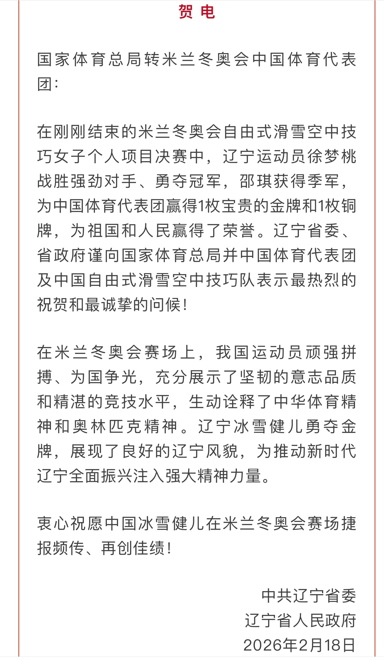 2月18日,辽宁省委省政府发贺电:在刚刚结束的米兰冬奥会自由式滑雪空中技巧女子个人项目决赛中,辽宁运动员徐梦桃战胜强劲对手、勇夺冠军,邵琪获得季军,为中国体育代表团赢得1枚宝贵的金牌和1枚铜牌,为祖国和人民赢得了荣誉。辽宁省委、省政府谨向国家体育总局并中国体育代表团及中国自由式滑雪空中技巧队表示最热烈的祝贺和最诚挚的问候!(辽宁发布)