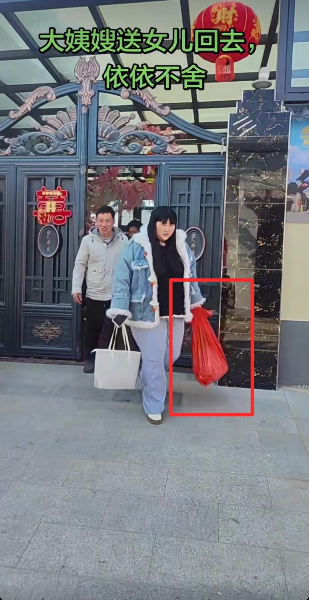 大衣嫂送女儿回家 果然还是离得近好 女儿回家都没有提什么东西,就用一个红色口袋提了点,两家离得不远,就几公里的路,也没必要拿好多吃的,用的 要是有需要的,直接一脚油就到娘家了,还得是离得近,想爸妈也可以随时回家看看