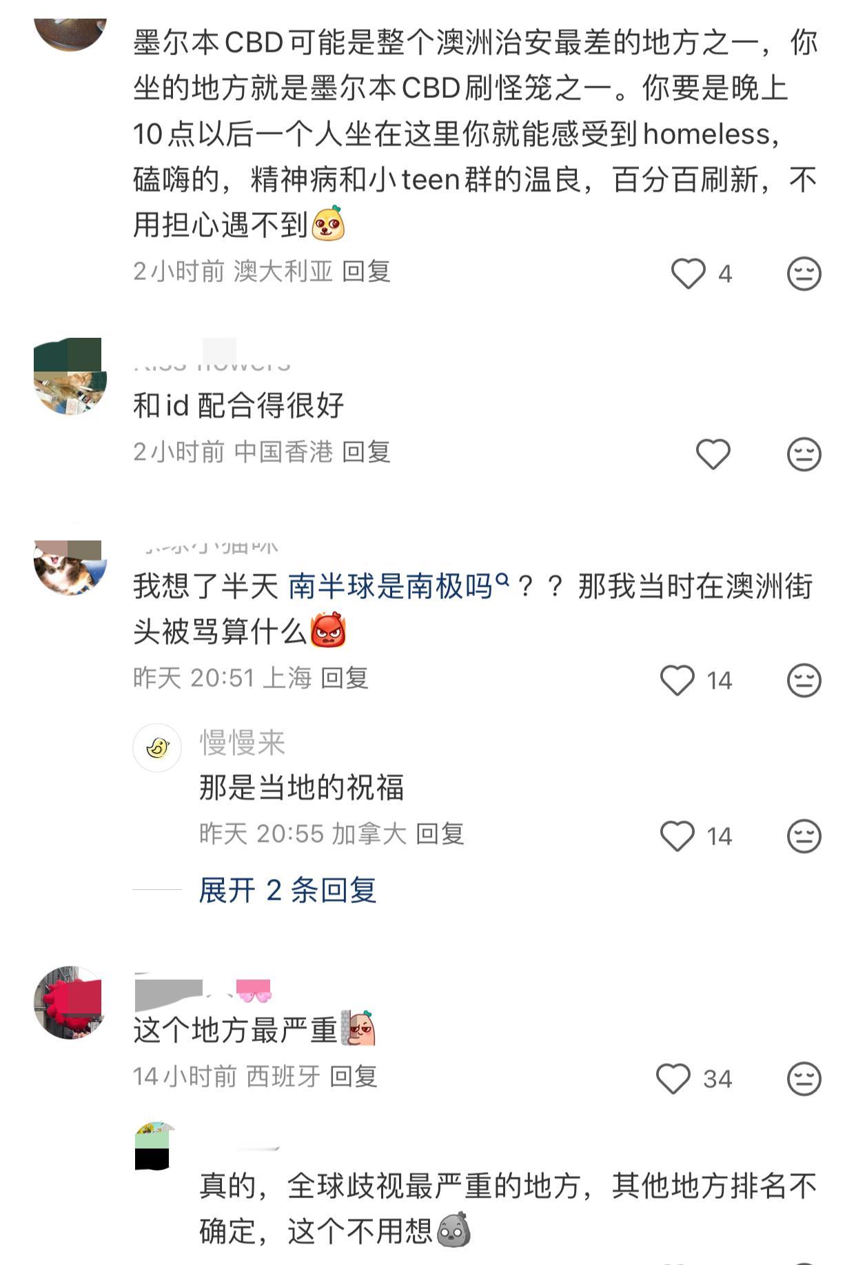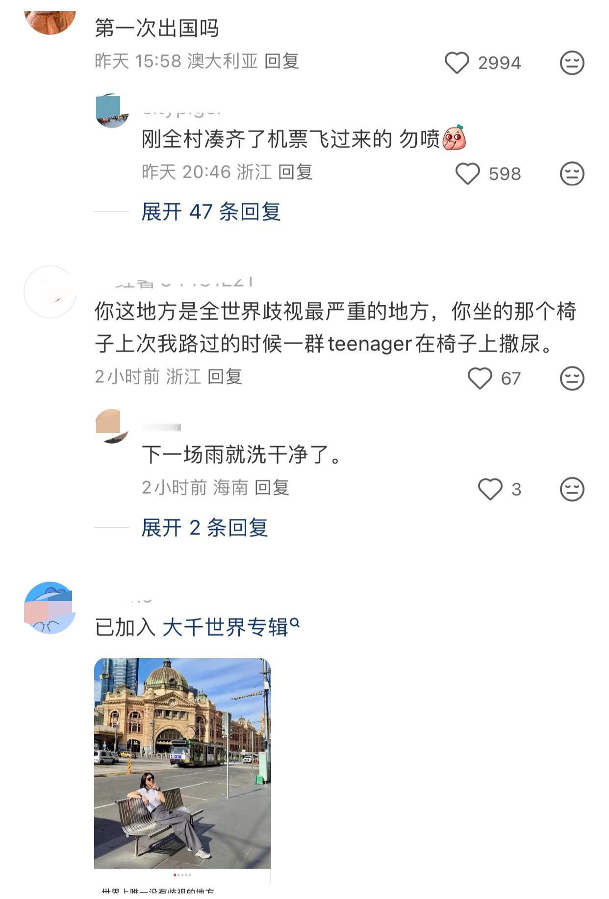 近日,一女网友去澳大利亚墨尔本旅游,她分享“世界上唯一没有歧视的地方”! 结果各种海外的IP出奇的团结,真的很难得看到这么一致的评论区…. 都说女网友所在的这个地方是澳洲治安最差的地方之一,所坐的地方是墨尔本的“刷怪笼”之一…😂 她觉得没有歧视,可能是因为听不懂吧…