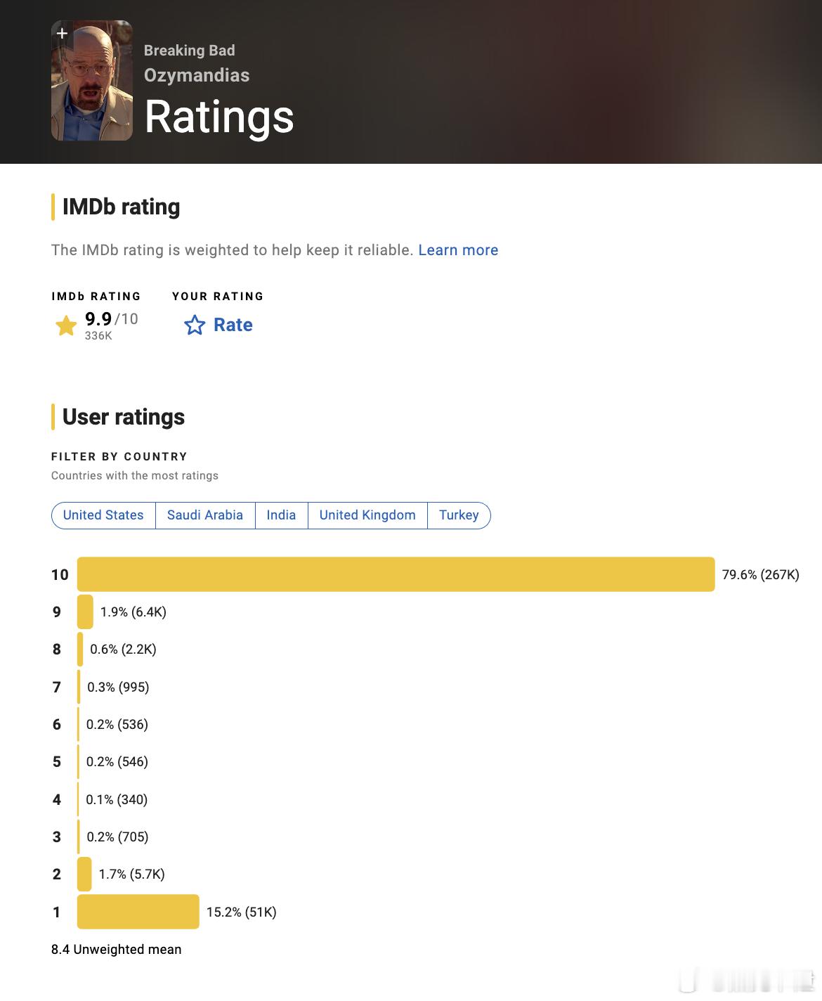 今天《绝命毒师》第五季第14集保持了13年的IMDb唯一满分单集评分突然跌到了9.9。