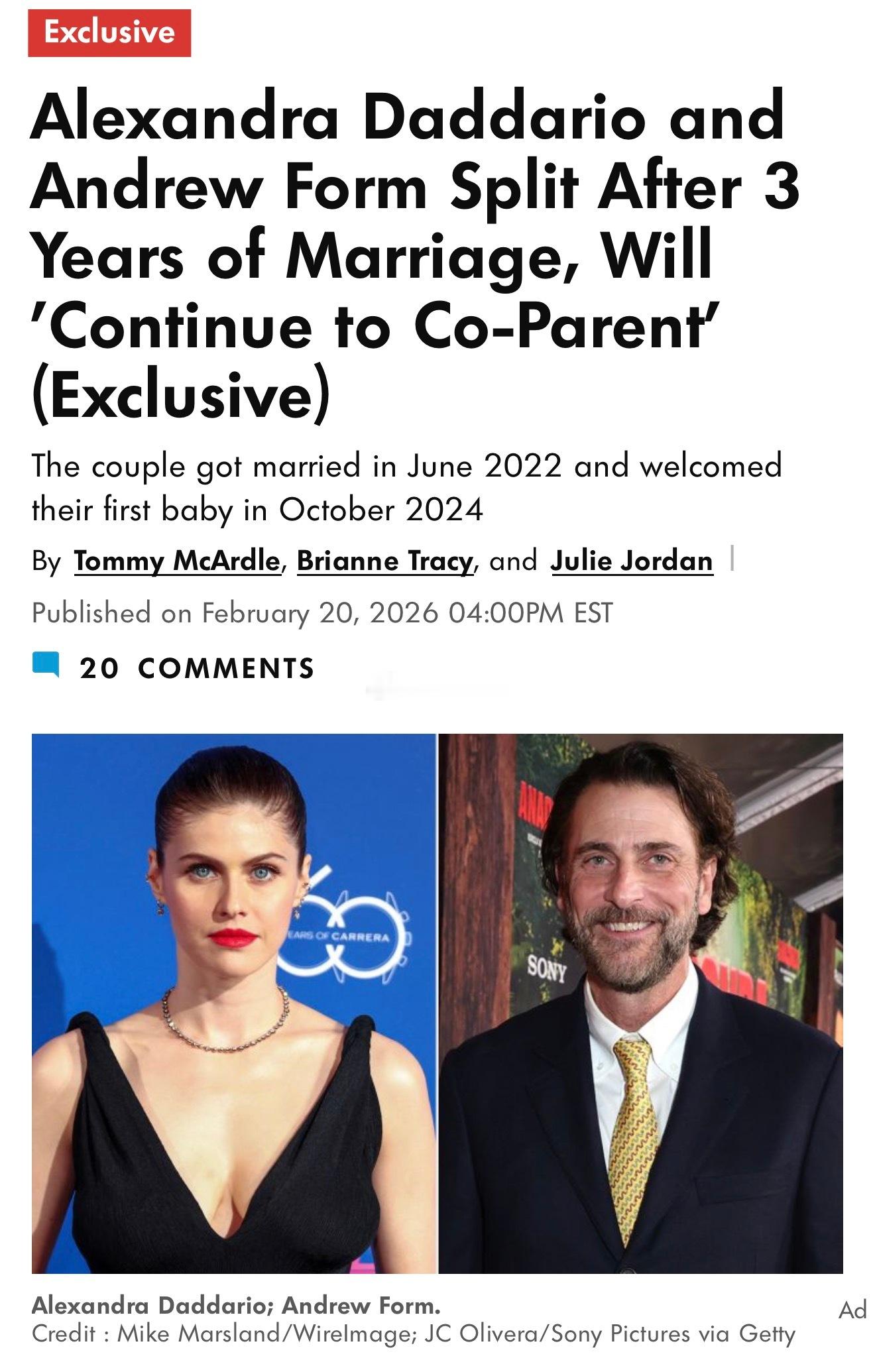 39岁的Alexandra Daddario(代表作《致命女人》《白莲花度假村第一季》)宣布跟57岁的制片人老公Andrew Form(制片代表作《人类清除计划》系列)在结婚三年后结束婚姻关系👇