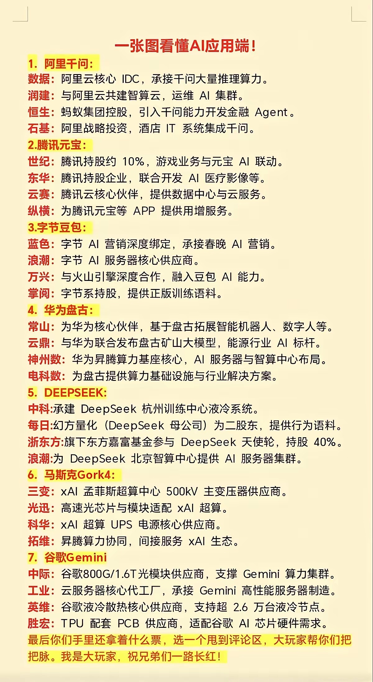 港股AI应用大涨!一张图看懂AI应用端!各大AI应用app深度合作上市公司!1.阿里千问2.腾讯元宝3.字节豆包4.华为盘古5.Deepseek6.马斯克Grok4、谷歌