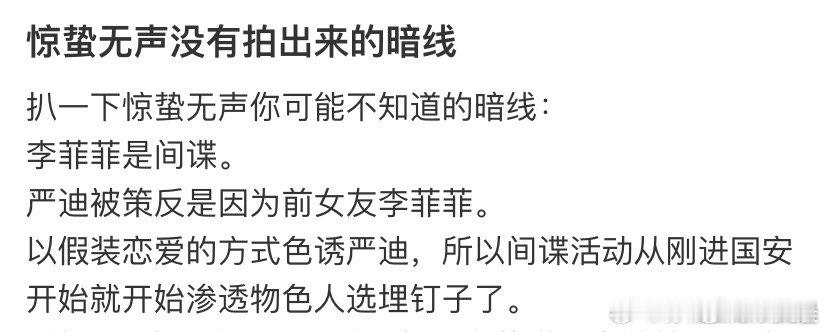 惊蛰无声暗线 二刷才发现《惊蛰无声》全是暗线!李菲菲根本不是普通前女友,更像是以恋爱接近严迪的间谍,两人三年都是互相试探的戏,细节越扒越惊心。