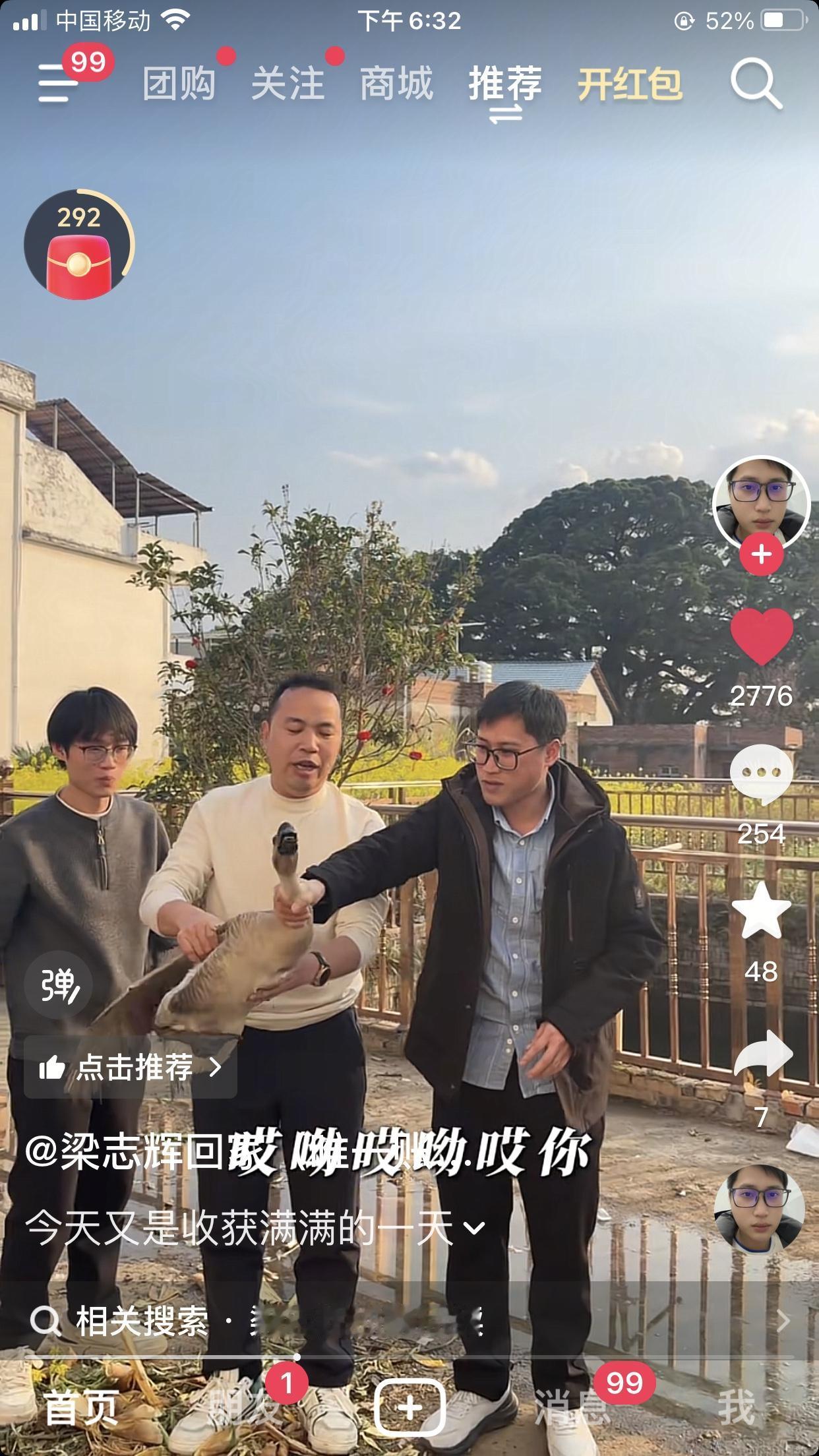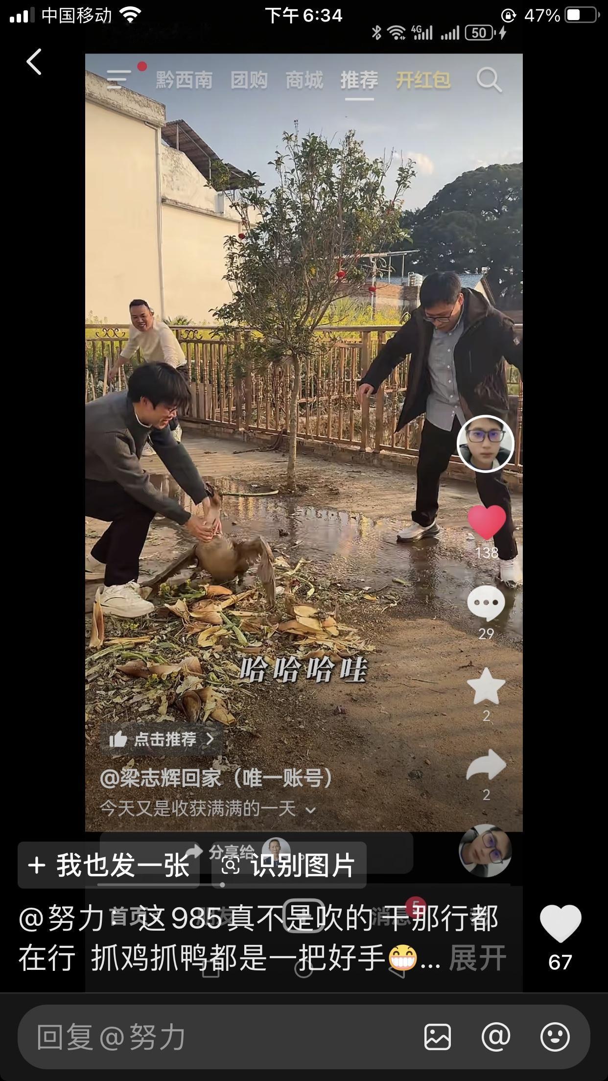别人新的一年是顺风顺水顺财神 梁志辉是顺鸡,顺鸭,顺鹅,顺鱼,再顺鸡蛋,再不济连奶狗都要顺两只回来养。 笑死我了,出去做客,告诉人家,看上你家那只鸭子,打电话叫老爸烧水。志辉连吃带顺,毫不客气[捂脸]985的老弟真不是徒有虚名,干啥 啥都行[赞]干一行行一行[赞]。抓鹅一把锁喉。 又是收获满满的一天。