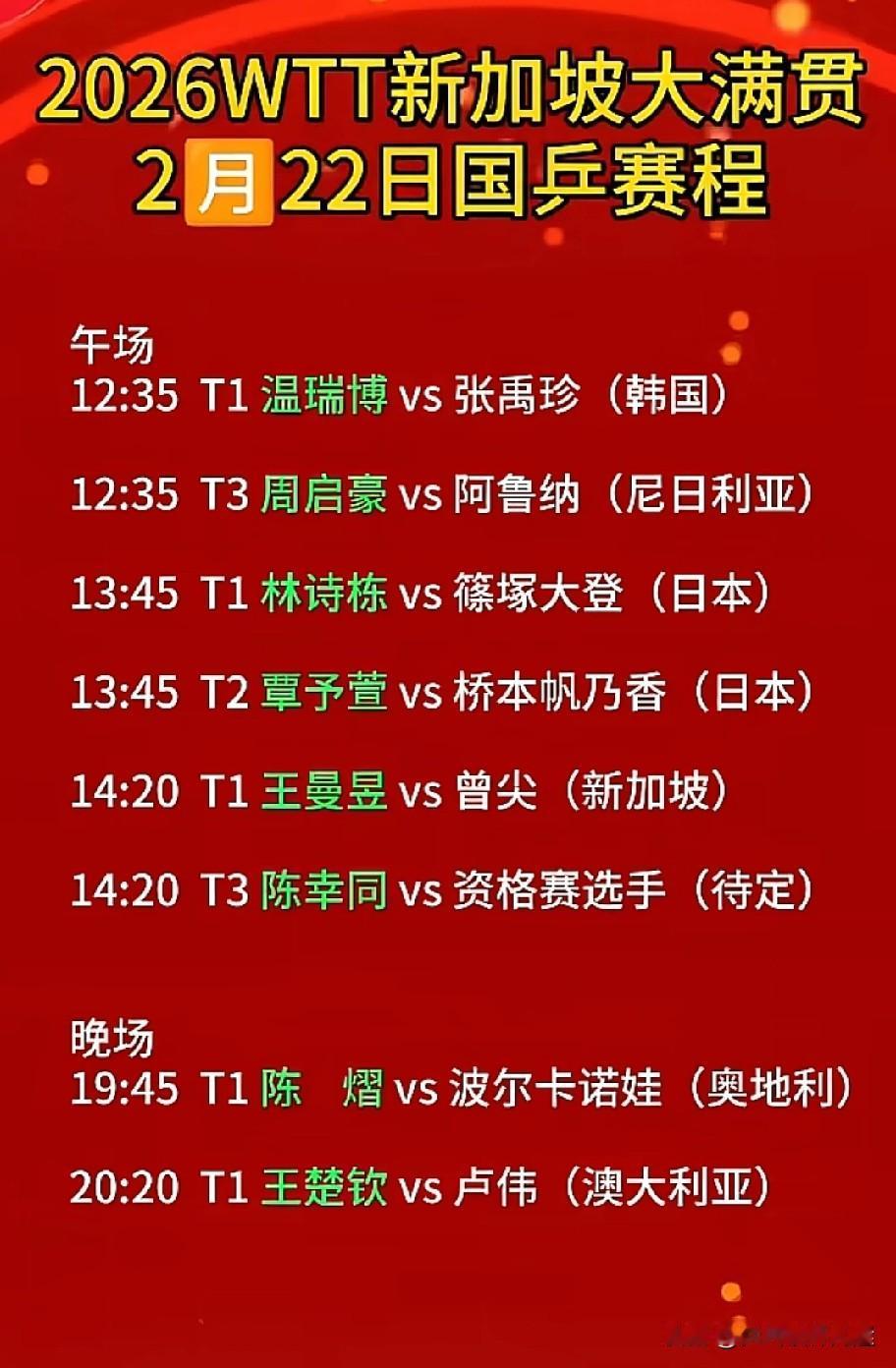 2026年WTT新加坡大满贯2月22日赛程如下图。 男队王楚钦,温瑞博,周启豪,林诗栋将出战。 女队王曼昱,陈幸同,陈熠,覃予萱将出战。 我们最喜欢的莎莎和蒯曼没有出场。 希望明天出战的男女队员都能取得好成绩,加油!