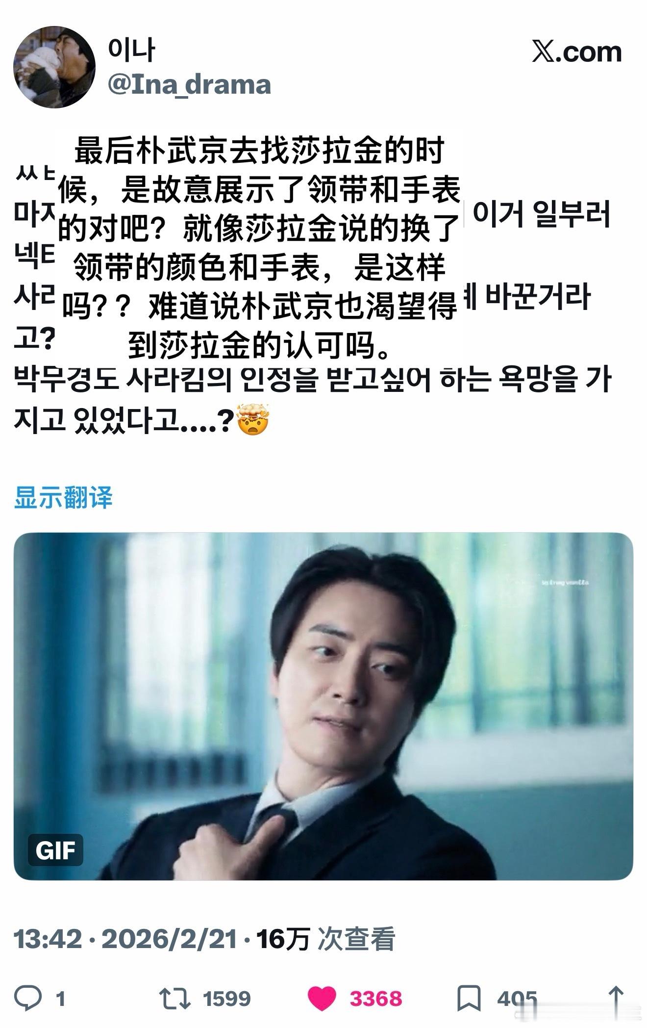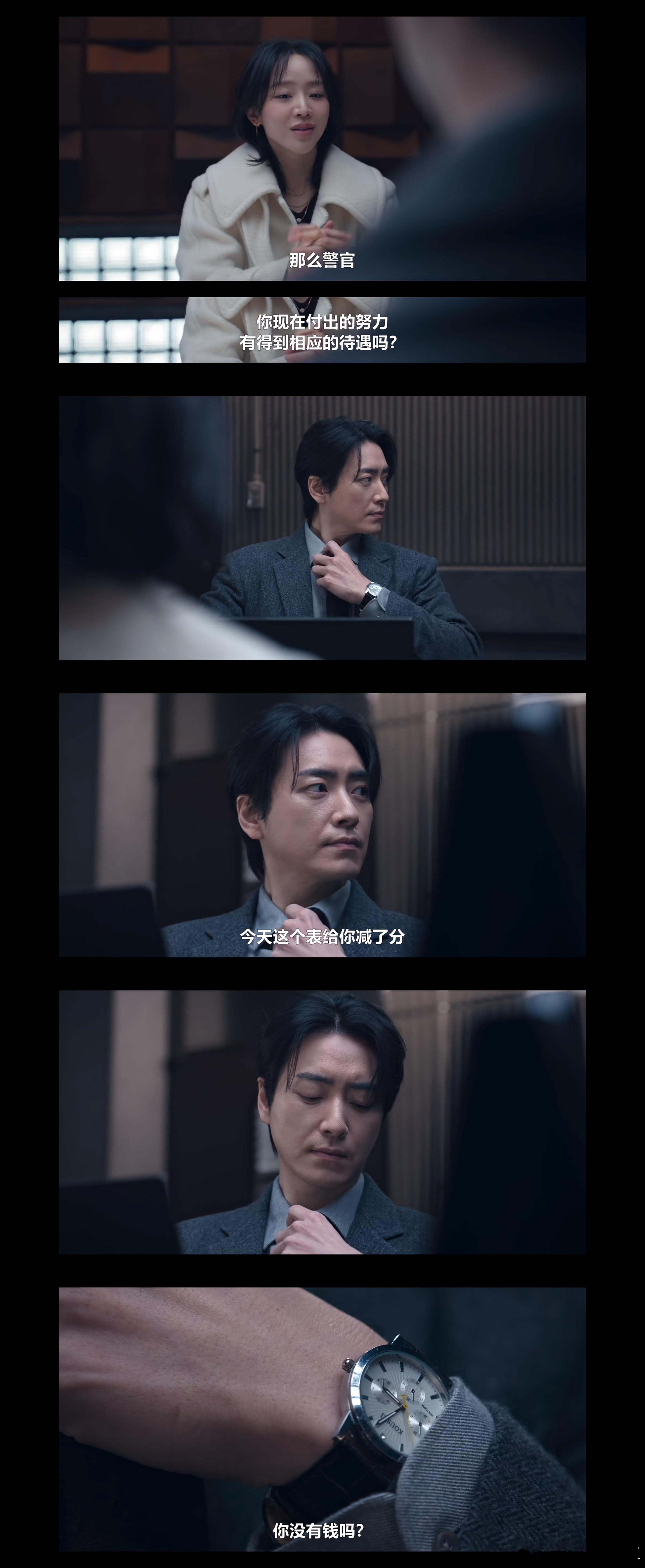 我真的觉得这部剧我白看了!!!!!虽然男主女主没见过几面一直都在审讯,但是有的观众就是能抓住细节嗑出门道,朴武京就是被女主吸引了,并且孔雀开屏了…🦚【热推】最后朴武京去找莎拉金的时候,是故意展示了领带和手表的对吧?就像莎拉金说的换了领带的颜色和手表,是这样吗??难道说朴武京也渴望得到莎拉金的认可吗。第一次见面,被说领带颜色不怎么样,朴武京就换了领带颜色。第二次见面,莎拉金又说手表不合适。第三次见面时,朴武京连手表也换了....这一届观众还是太细节了